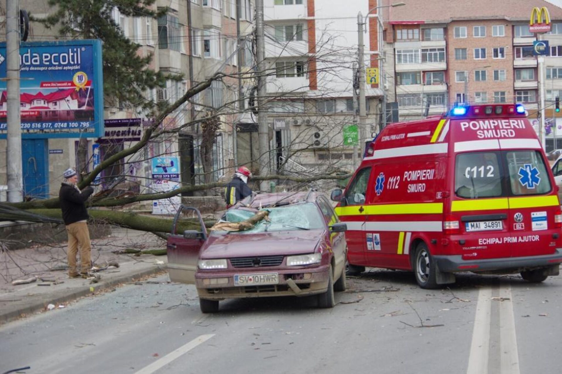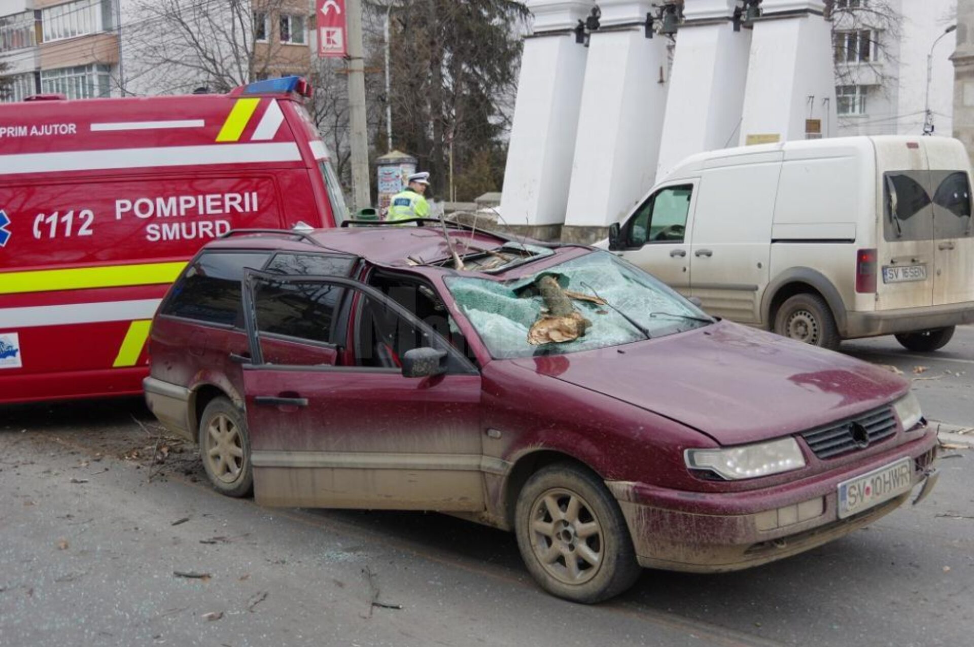 O mașină care circula pe bulevardul principal al Sucevei, Ana Ipătescu, a fost strivită de un copac care s-a prăbușit în stradă, din Parcul Central. Incidentul s-a petrecut în jurul orei 08.30 dimineața, traficul rutier fiind blocat temporar, până la sosirea pompierilor, care au degajat strada de ramurile căzute, trunchiul arborelui fiind apoi tăiat cu druja.