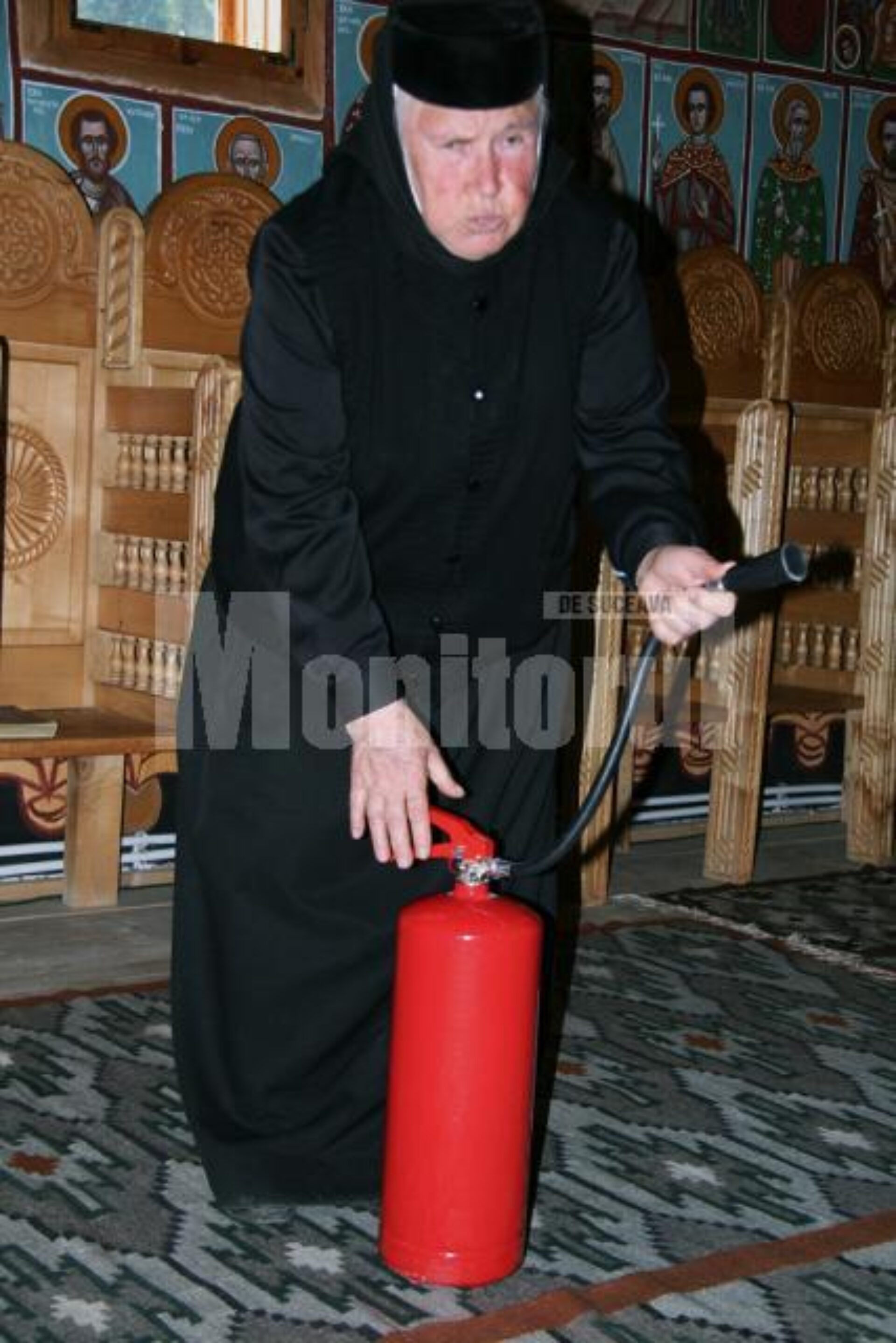 Fără să stea prea mult pe gânduri, maica stareță a pus mâna pe stingător și a arătat că știe să-l folosească, repetând fără ezitare etapele prezentate de colonel.