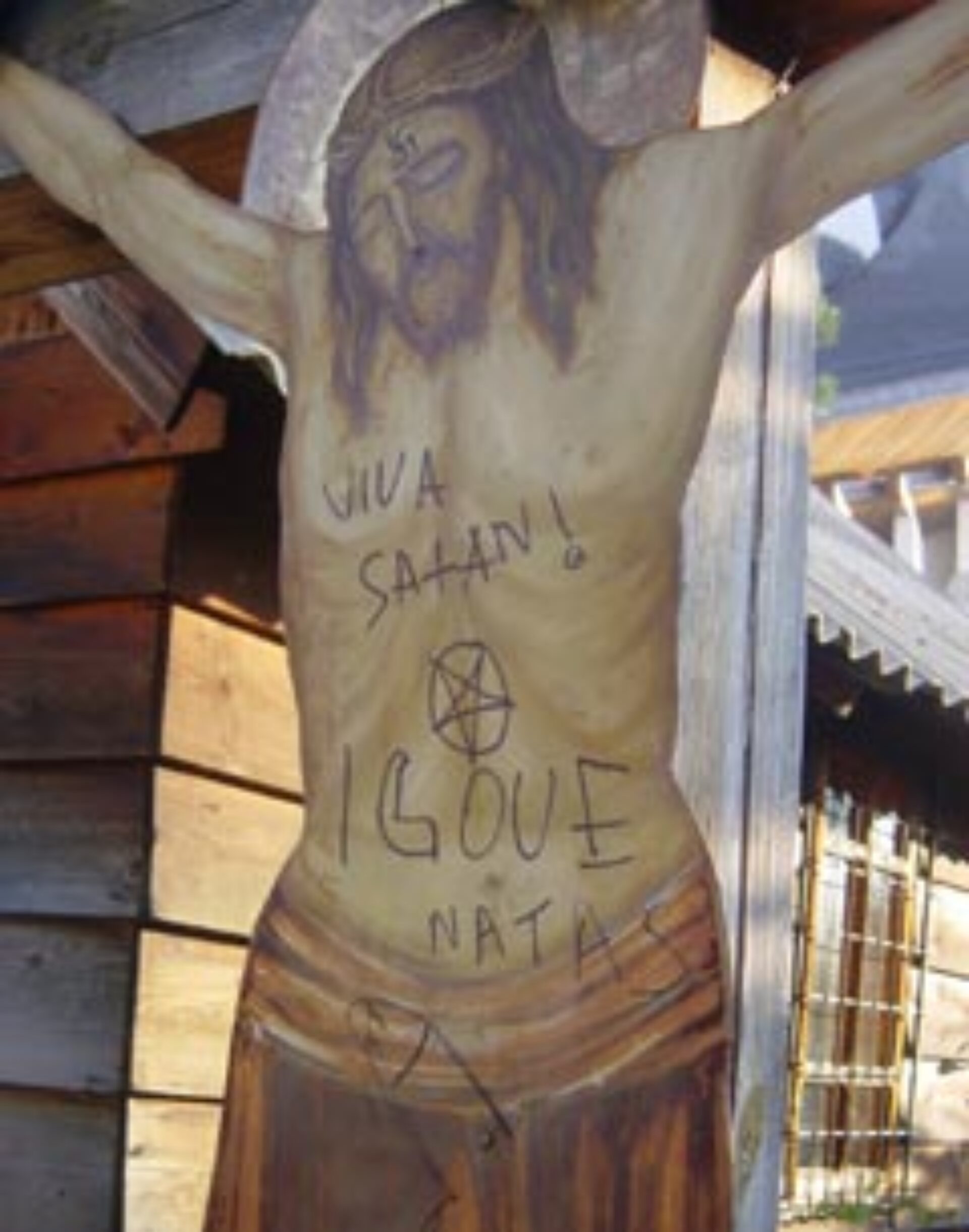 – Mesaje de genul „Viva Satan” și „I Love Natas” au fost găsite de reprezentanții bisericii „Nașterea Maicii Domnului” sâmbătă dimineață chiar pe troița cu chipul lui Iisus Hristos