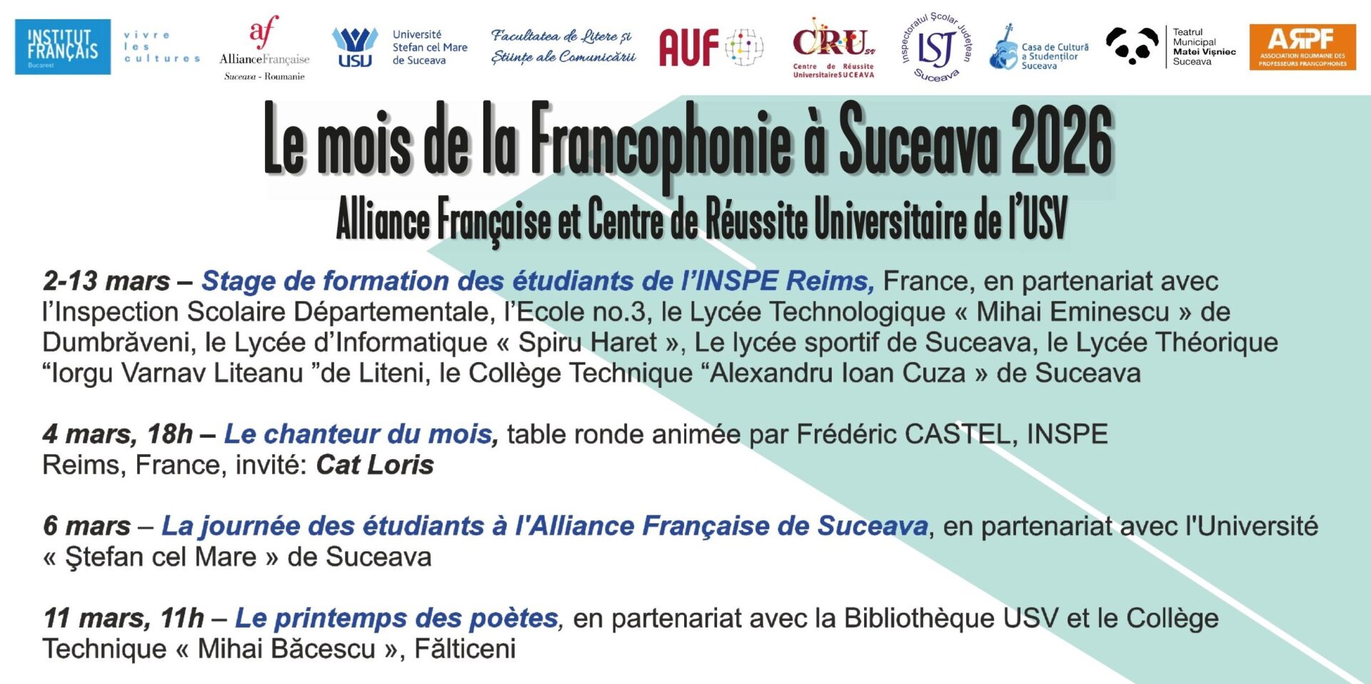 Tot în luna martie, Alianţa Franceză din Suceava este parteneră a spectacolului-concurs judeţean „Soyons francophones”, organizat de Inspectoratul Şcolar Judeţean în parteneriat cu Facultatea de Litere şi Ştiinţe ale Comunicării şi Asociaţia Română a Profesorilor Francofoni (ARPF) pe 21 martie.