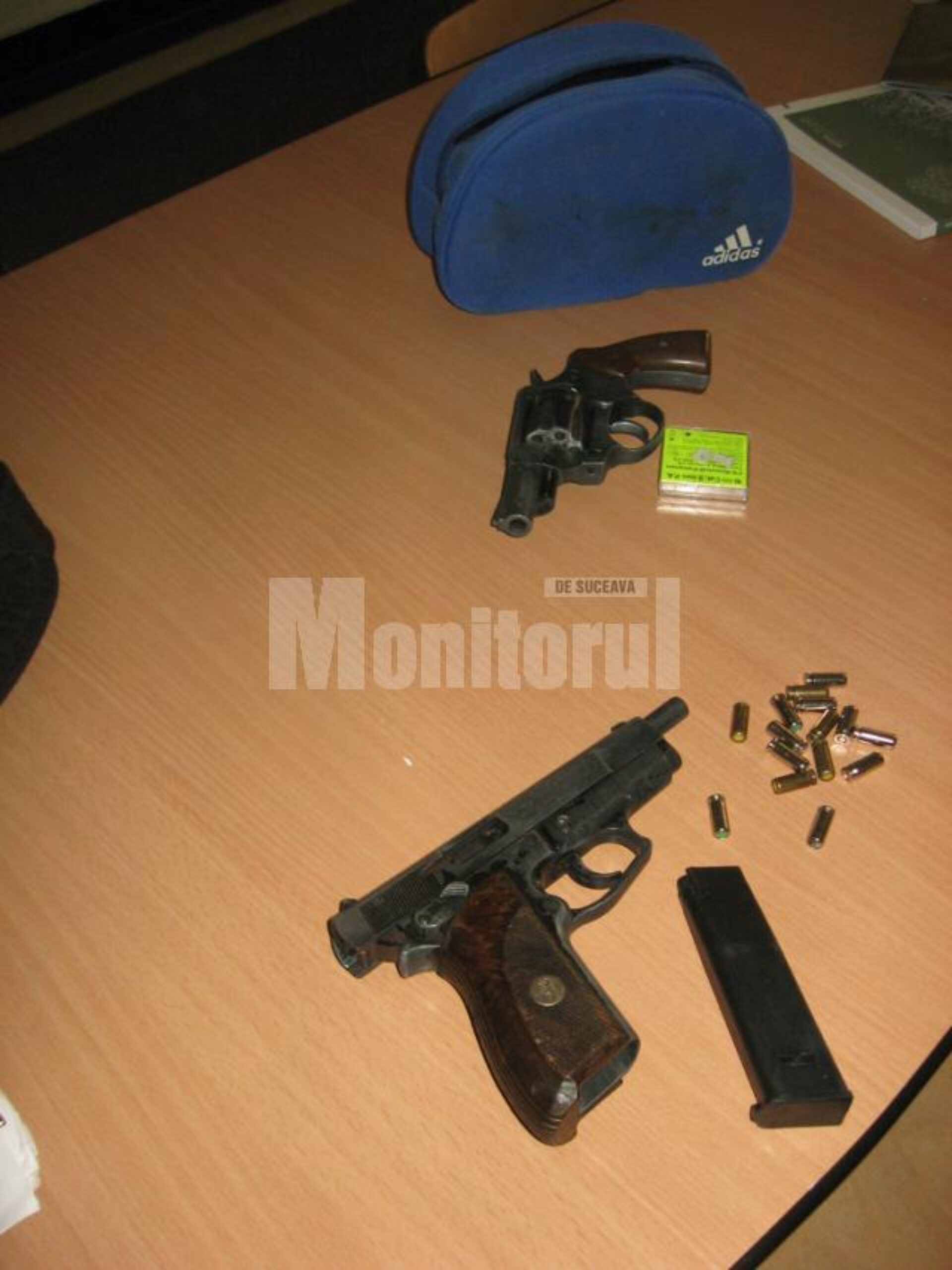 În aceeași zi, se arată în comunicatul poliției, s-a efectuat o percheziție domiciliară și la locuința lui Duțu Dorin Cărpuș, iar în subsolul blocului, la intrarea în boxa aparținând apartamentului acestuia, polițiștii au găsit ascunsă după o conductă de canalizare o borsetă în care se afla un revolver pentru muniție iritant lacrimogenă de proveniență germană, de calibru 9 milimetri, fără serie, în stare de funcționare, și cinci cartușe cu gaze de același calibru.