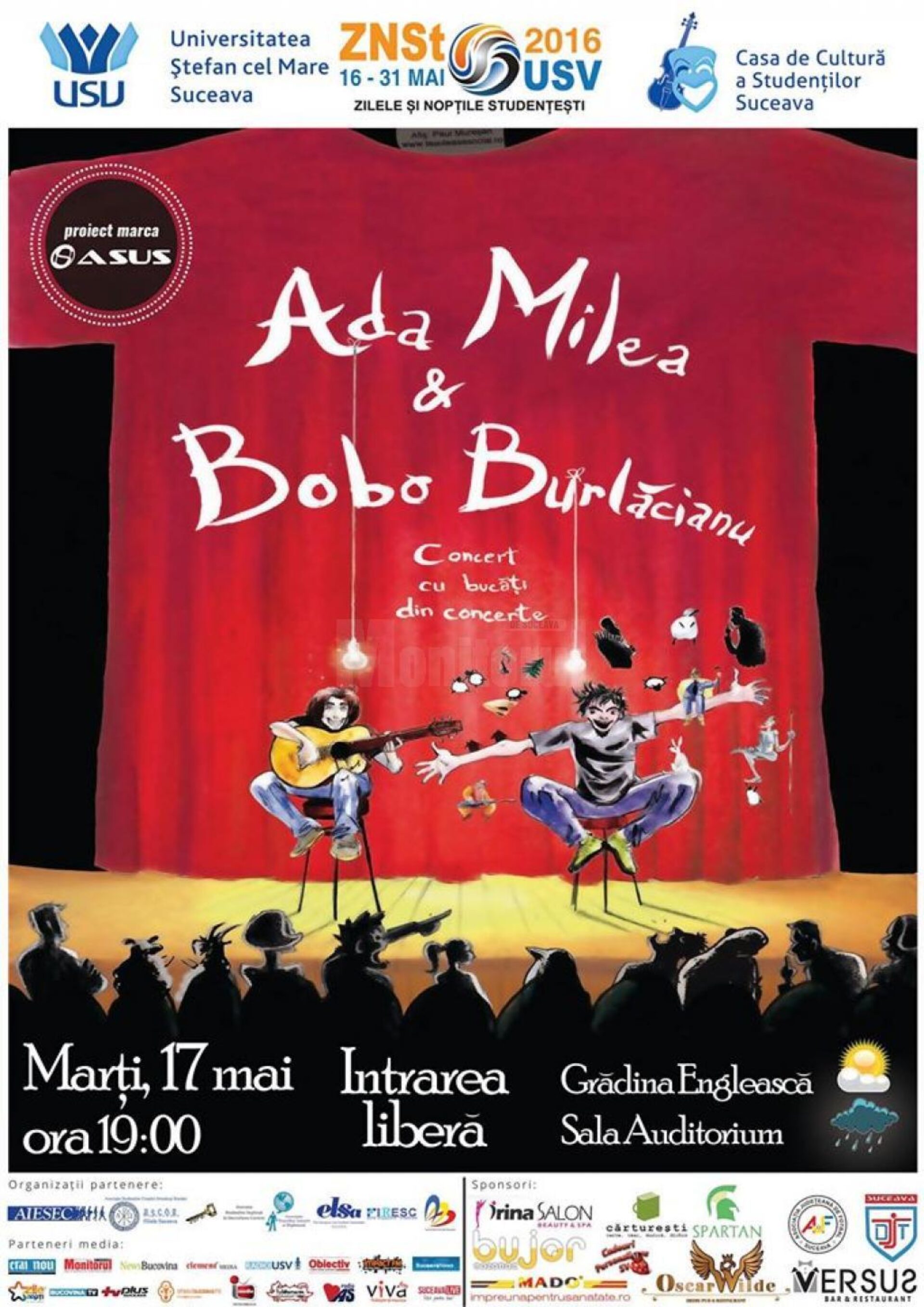 Ada Milea și Bobo Burlăcianu, de la trupa Fără Zahăr, vor concerta la Universitatea „Ștefan cel Mare” Suceava (USV), marți, 17 mai, de la ora 19.00. Evenimentul va avea loc în „Grădina Englezească” din campus, însă dacă vremea va fi nefavorabilă, acesta va fi găzduit de Auditorium „Joseph Schmidt”.