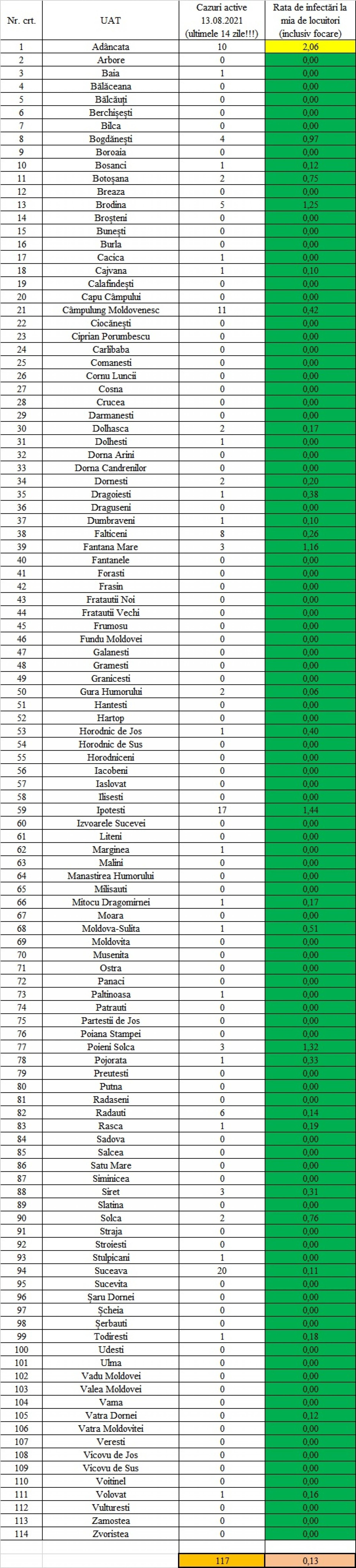 În municipiul Suceava sunt 20 de cazuri active și o incidență de 0,11 la mie. Incidență mai mare, peste 1 la mie, este la Brodina – 1,25 la mie, la Fântâna Mare – 1,16 la mie, la Ipotești – 1,44 la mie și la Poieni Solca – 1,32 la mie. În total, în județ sunt acum 117 cazuri de Covid active și o incidență de 0,13 la mie.