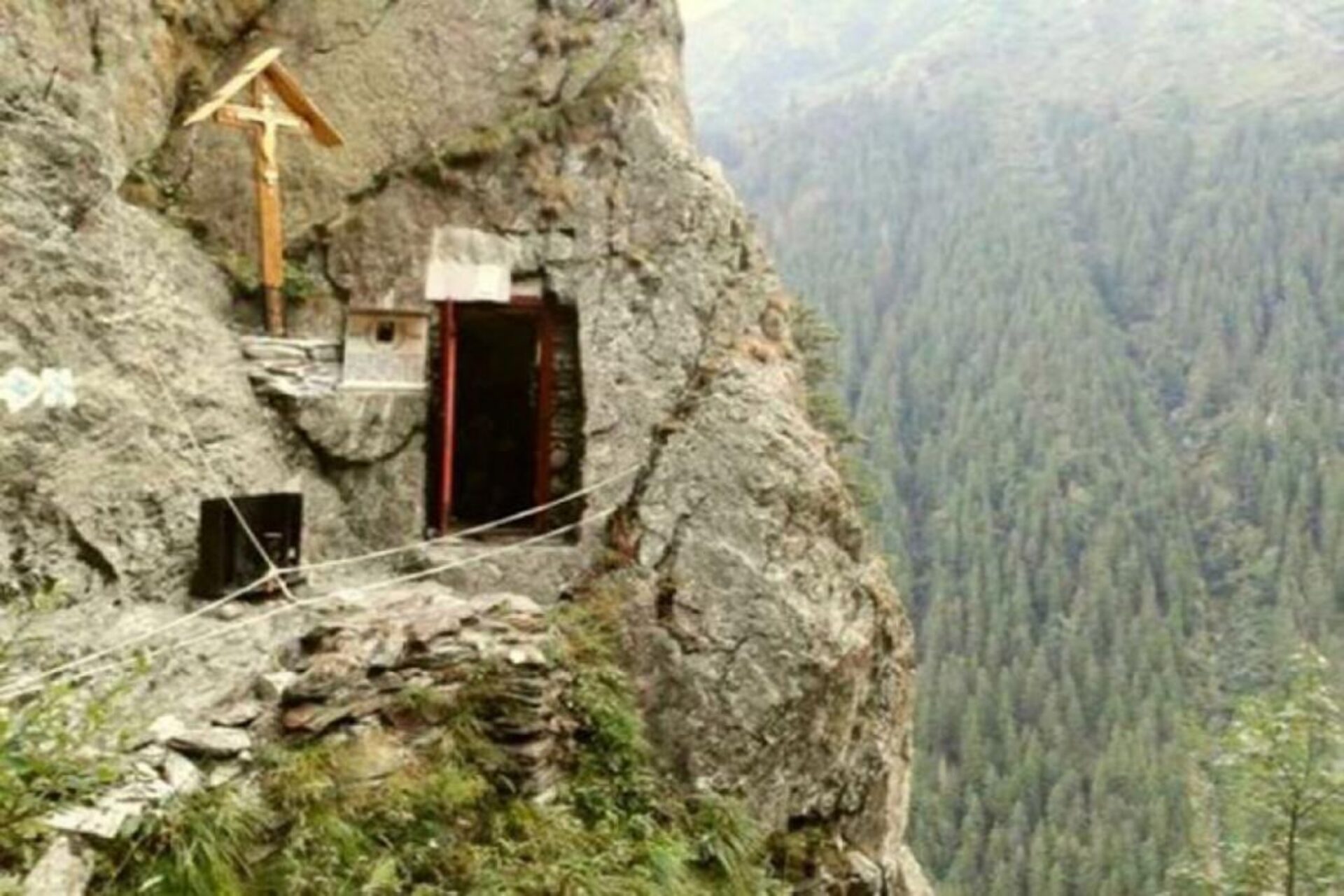 Ajutat de credincioși, părintele a scobit, din interior spre exterior, o deschizătură în stâncă, cu înălțimea 1.75 metri și lățimea de 0.80 metri, cu intenția de a ajunge în inima muntelui. Construcția nu a fost terminată, pentru că părintele a constatat că se infiltrează apă.