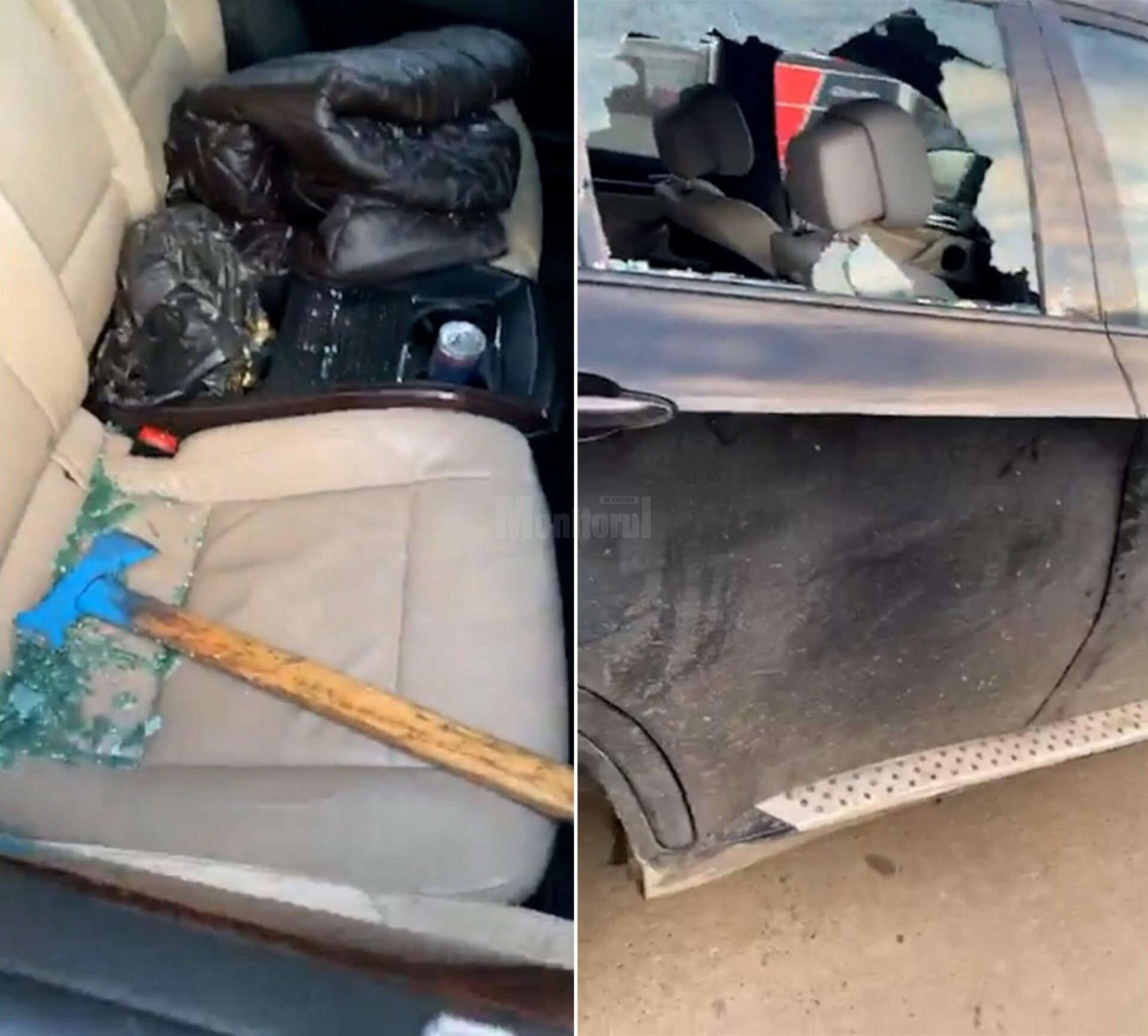 Aici, în timp ce tânărul era coborât din mașină, un individ a venit cu un obiect contondent și l-a aruncat într-un geam lateral al BMW-ului.