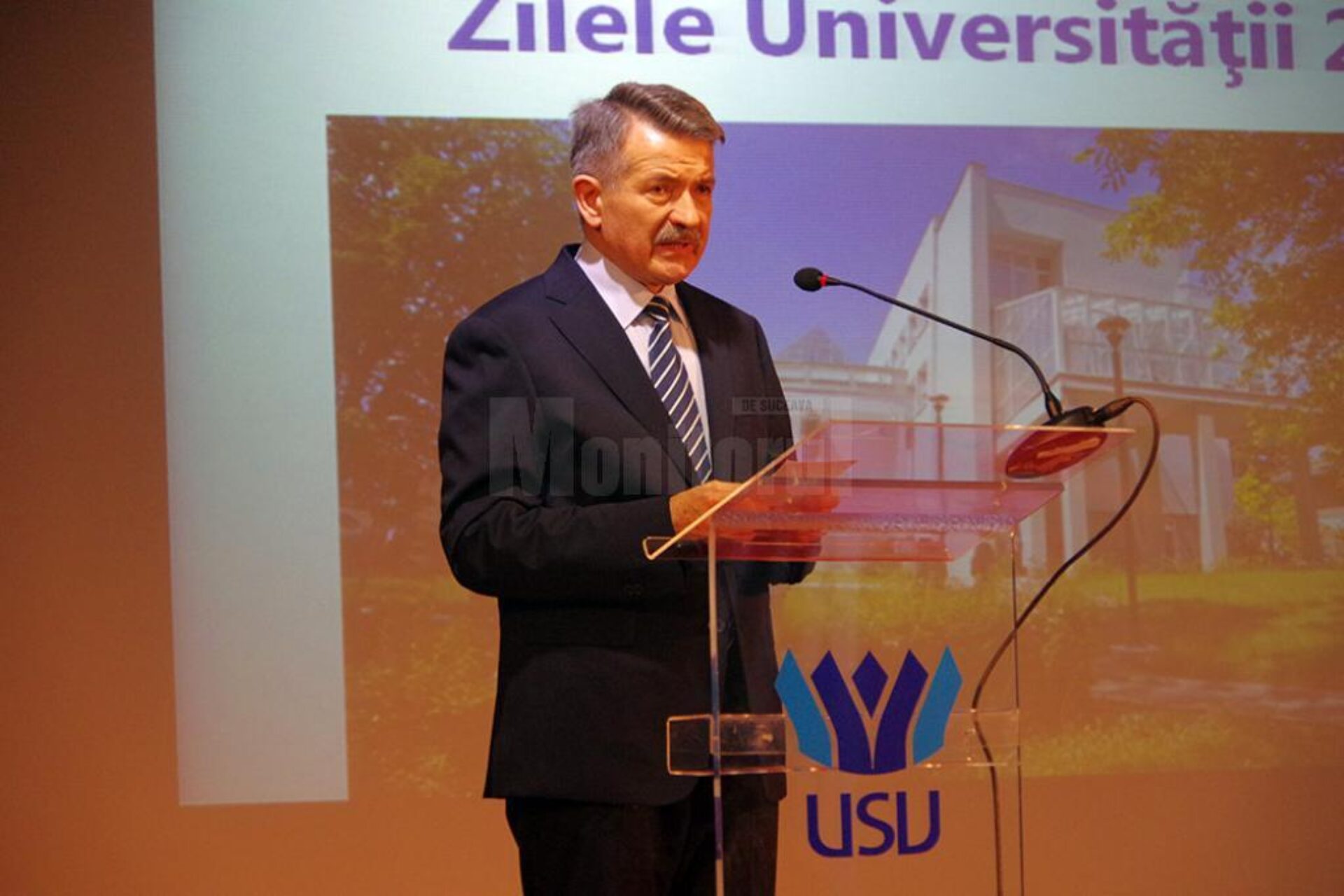 În introducere, prorectorul USV Ștefan Purici a punctat câteva dintre reperele evoluției profesionale a fostului rector al Universității (2004-2012), subliniind o serie dintre inițiativele, proiectele și reușitele ce poartă semnătura lui Adrian Graur.