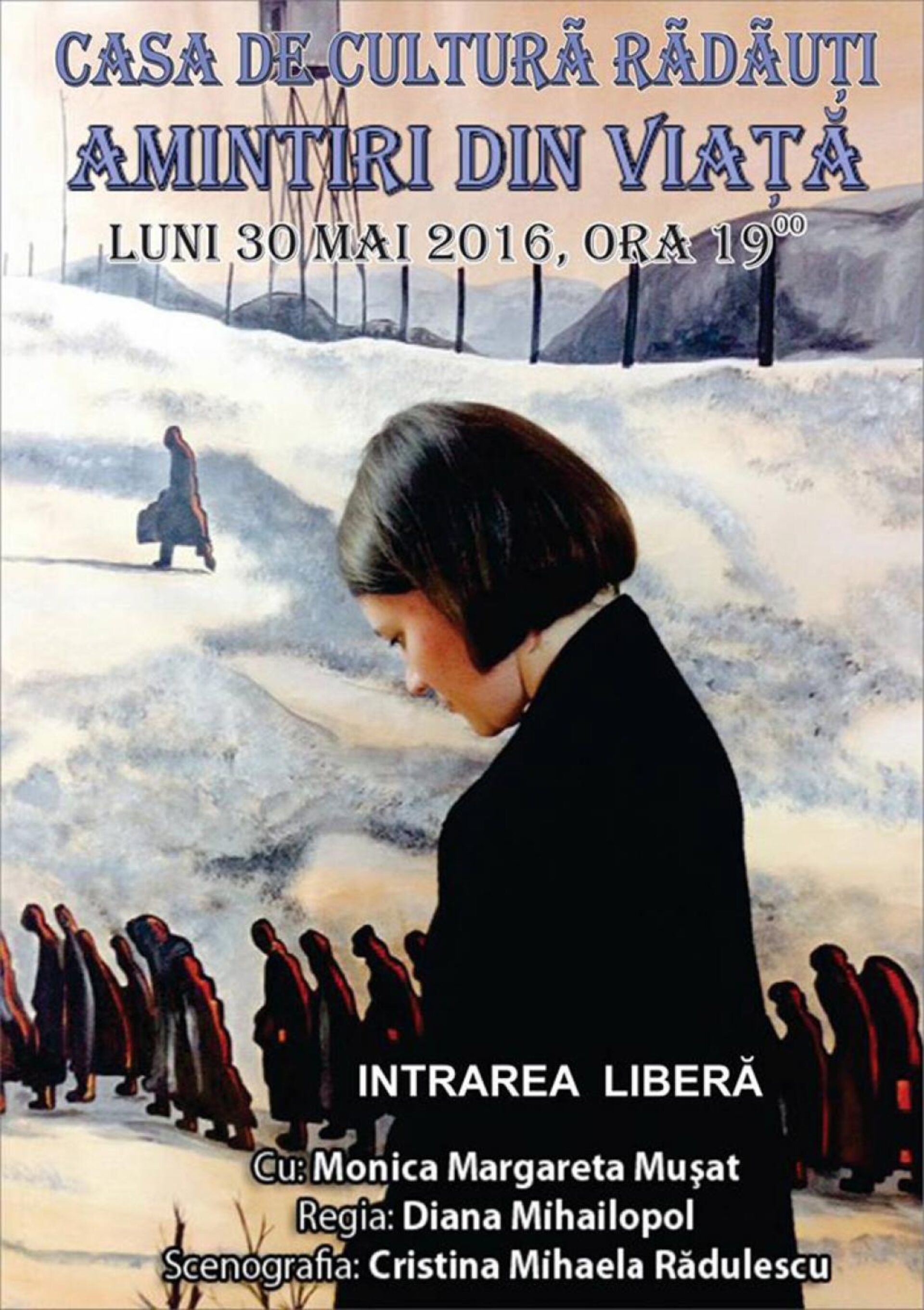 La Casa de Cultură din Rădăuți va fi prezentat luni, 30 mai a.c., la ora 19.00, spectacolul de teatru-monolog „Amintiri din viață”, cu Monica Margareta Mușat.