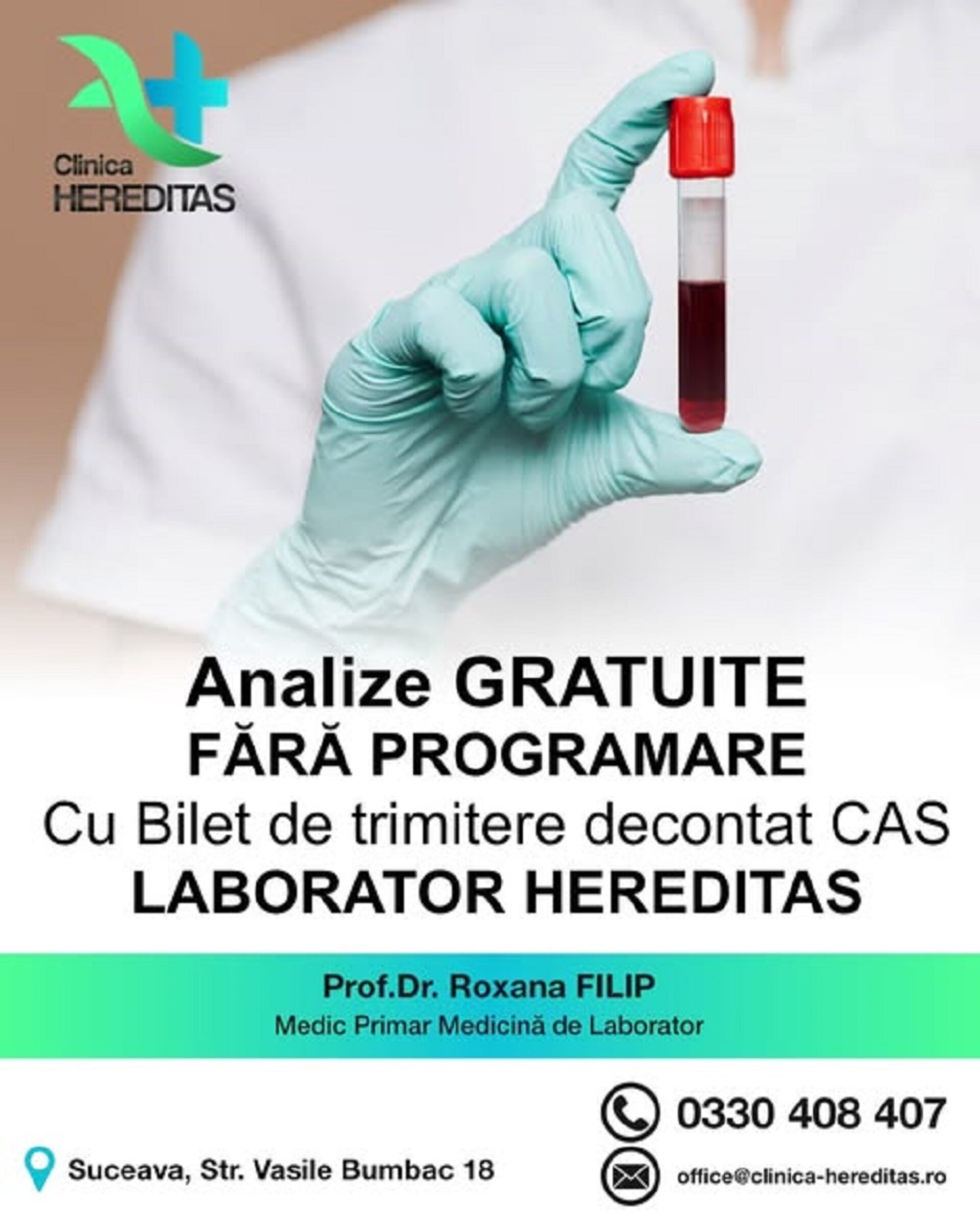 Puteți beneficia de analize medicale gratuite, cu bilet de trimitere, în laboratorul Hereditas, fără a fi nevoie de o programare.
