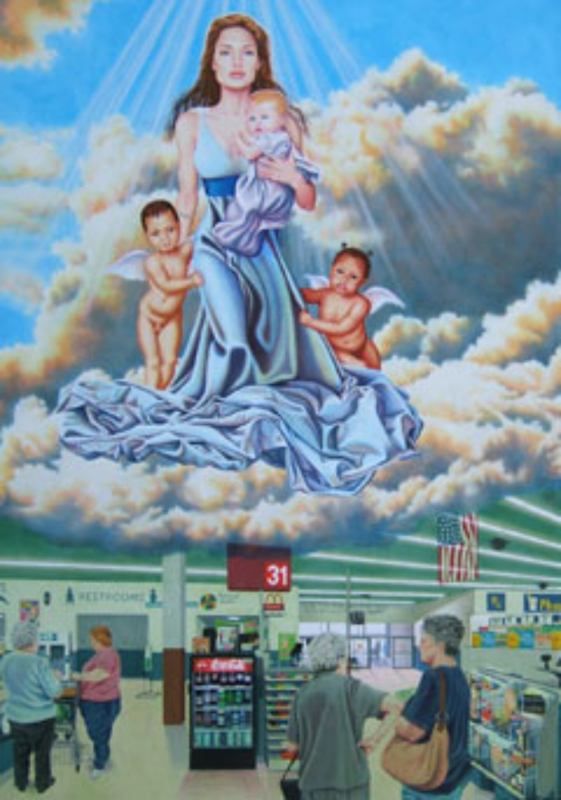 Angelina Jolie, iubita lui Brad Pitt și vedetă a filmului „Tomb Raider”, este prezentată în postura Fecioarei Maria într-un tablou controversat realizat de pictorița Kate Kretz, transmite ediția online a Evening Standard.
