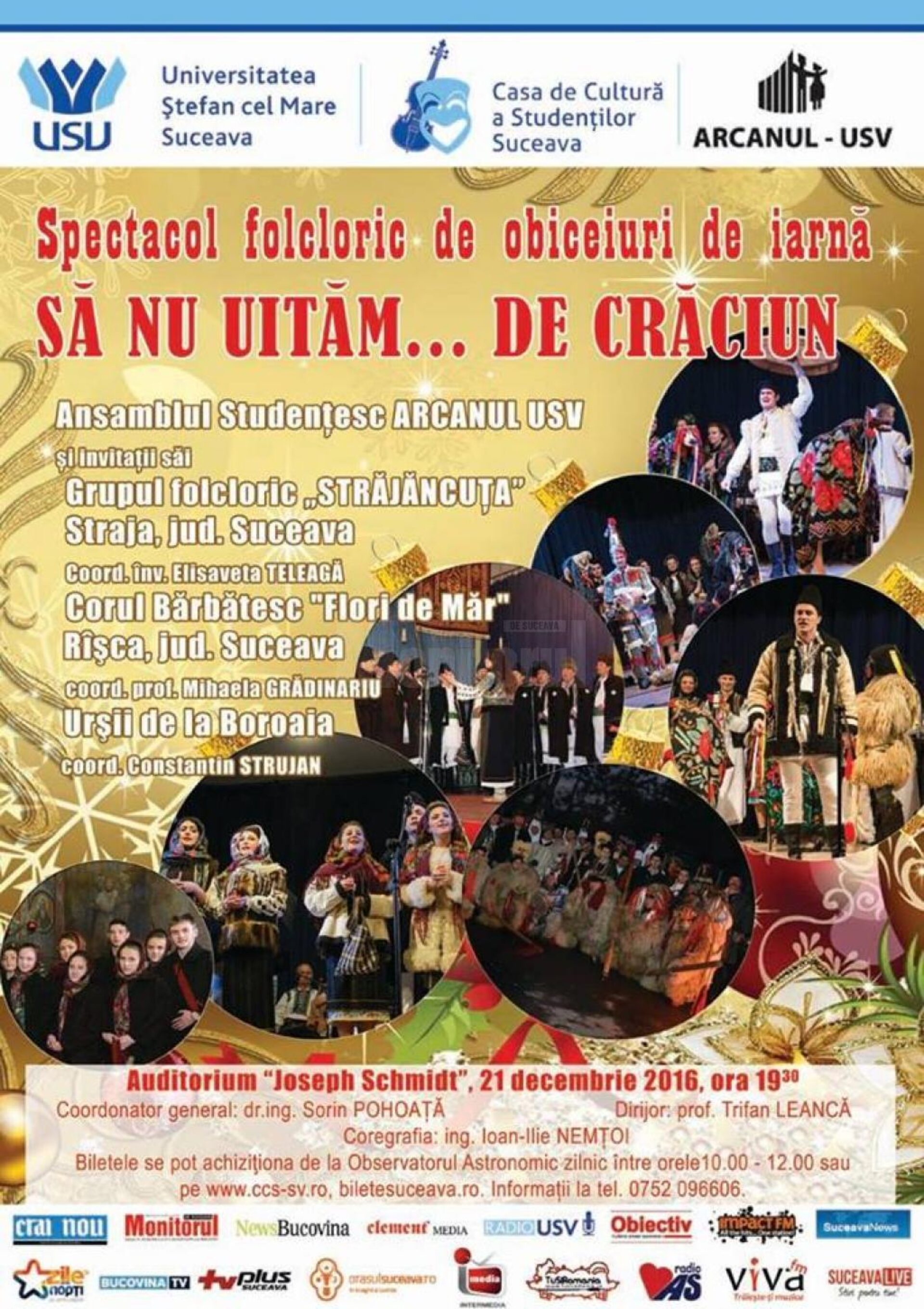 „Vă așteptăm la spectacolul tradițional deja «Să nu uităm… de Crăciun». Sperăm să vă faceți timp și să veniți la Auditorium «Joseph Schmidt» pentru un spectacol de obiceiuri de iarnă, așa ca în fiecare an, unic în Suceava. În acest an, pornim cu colindele Corului Bărbătesc «Flori de Măr» de la Râșca și ale Grupului Folcloric «Străjăncuța» din Straja, continuând apoi noi, Ansamblul Studențesc «Arcanul USV», cu obiceiurile de iarnă de la casa gospodarului bucovinean, terminând cu Urșii de la Boroaia”, transmit cei de la „Arcanul USV”.