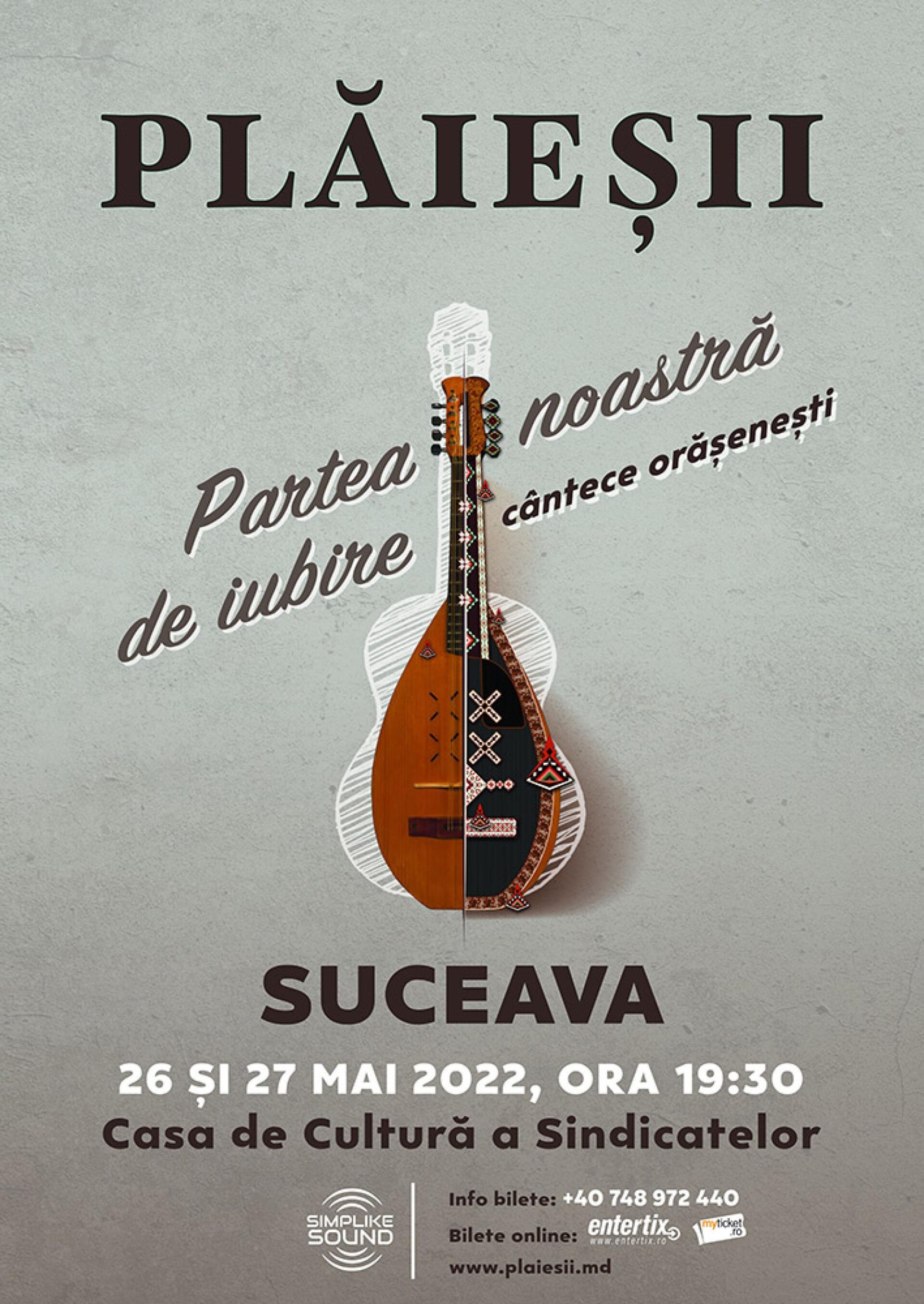 Ansamblul etnofolcloric „Plăieșii”, condus de Nicolae Gribincea, va susține două spectacole pe scena suceveană.Joi, 26 mai, și vineri, 27 mai, de la ora 19.30, „Plăieșii” și Nicolae Gribincea vor fi în mijlocul publicului sucevean. Spectacolul se numește „Partea noastră de iubire”. Prețurile biletelor: 190 de lei, 170 de lei, 150 de lei sau 100 de lei, în funcție de așezarea în sală. Biletele pot fi cumpărate de la secretariatul Casei de Cultură a Sindicatelor Suceava, intrare B, etajul 1, tel. 0230 523 718, program L-V: 09-15, și online pe entertix.ro, myticket.ro.