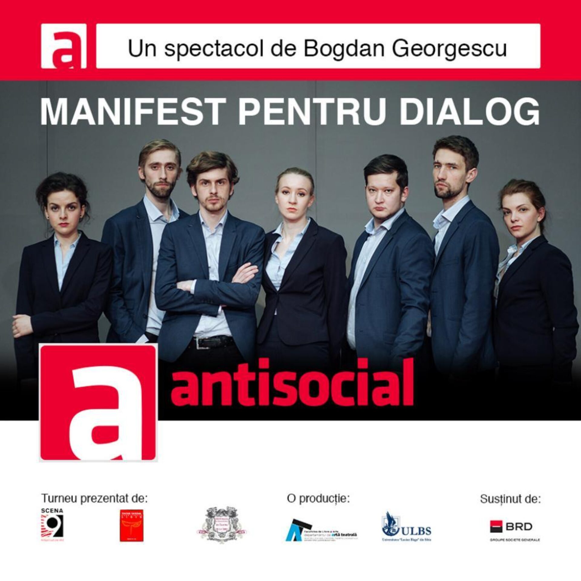 Spectacolul „Antisocial”, produs de Teatrul Național „Radu Stanca“ și Departamentul de Artă Teatrală al Universității „Lucian Blaga“ din Sibiu, spectacol prezentat în turneul „Manifest pentru Dialog”, susținut de platforma Scena9 – un hotpost cultural al BRD, programat pentru astăzi, la ora 19.00, în Sala Dom Polski din municipiul Suceava, va avea loc la ora 19:30, în Sala Mică a Casei de Cultură a Sindicatelor.