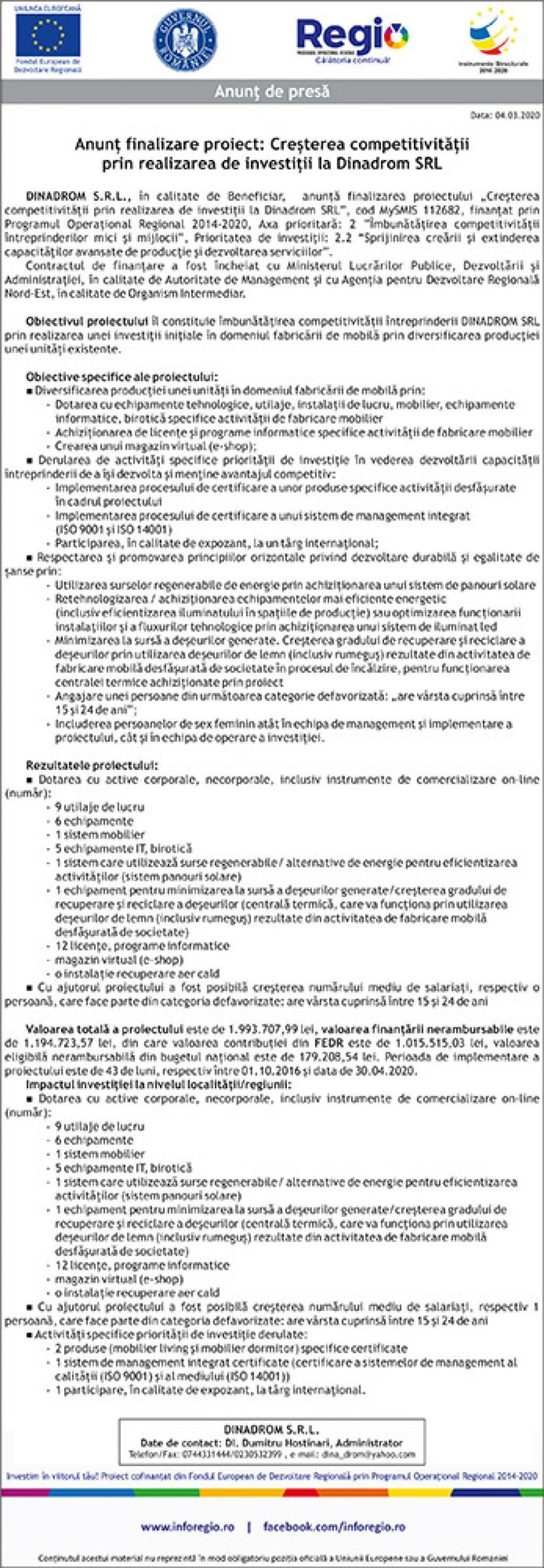 DINADROM S.R.L., în calitate de Beneficiar, anunță finalizarea proiectului „Creșterea competitivității prin realizarea de investiții la Dinadrom SRL”, cod MySMIS 112682, finanțat prin Programul Operațional Regional 2014-2020, Axa prioritară: 2 ”Îmbunătățirea competitivității întreprinderilor mici și mijlocii”, Prioritatea de investiții: 2.2 “Sprijinirea creării și extinderea capacităților avansate de producție și dezvoltarea serviciilor”.
