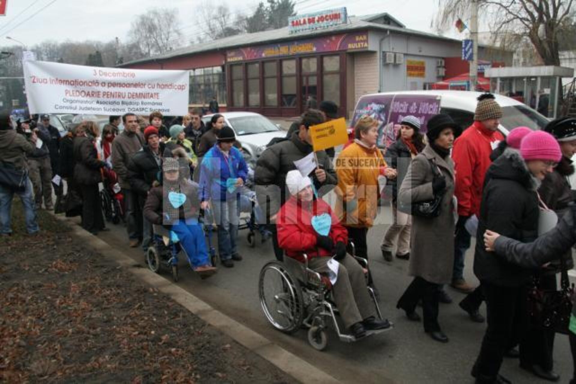 De Ziua Internațională a Persoanelor cu Handicap, ieri, 3 decembrie, circa 300 de persoane, copii cu dizabilități, însoțitori, părinți, dar și tineri voluntari, au organizat un marș, denumit „Pledoarie pentru demnitate”. Participanții au parcurs, pe jos sau în cărucioare, distanța dintre Primăria Suceava și Magazinul Bucovina, în dorința de a atrage atenția sucevenilor că împreună, persoane normale și persoane cu nevoi speciale vor putea schimba atitudinea societății.