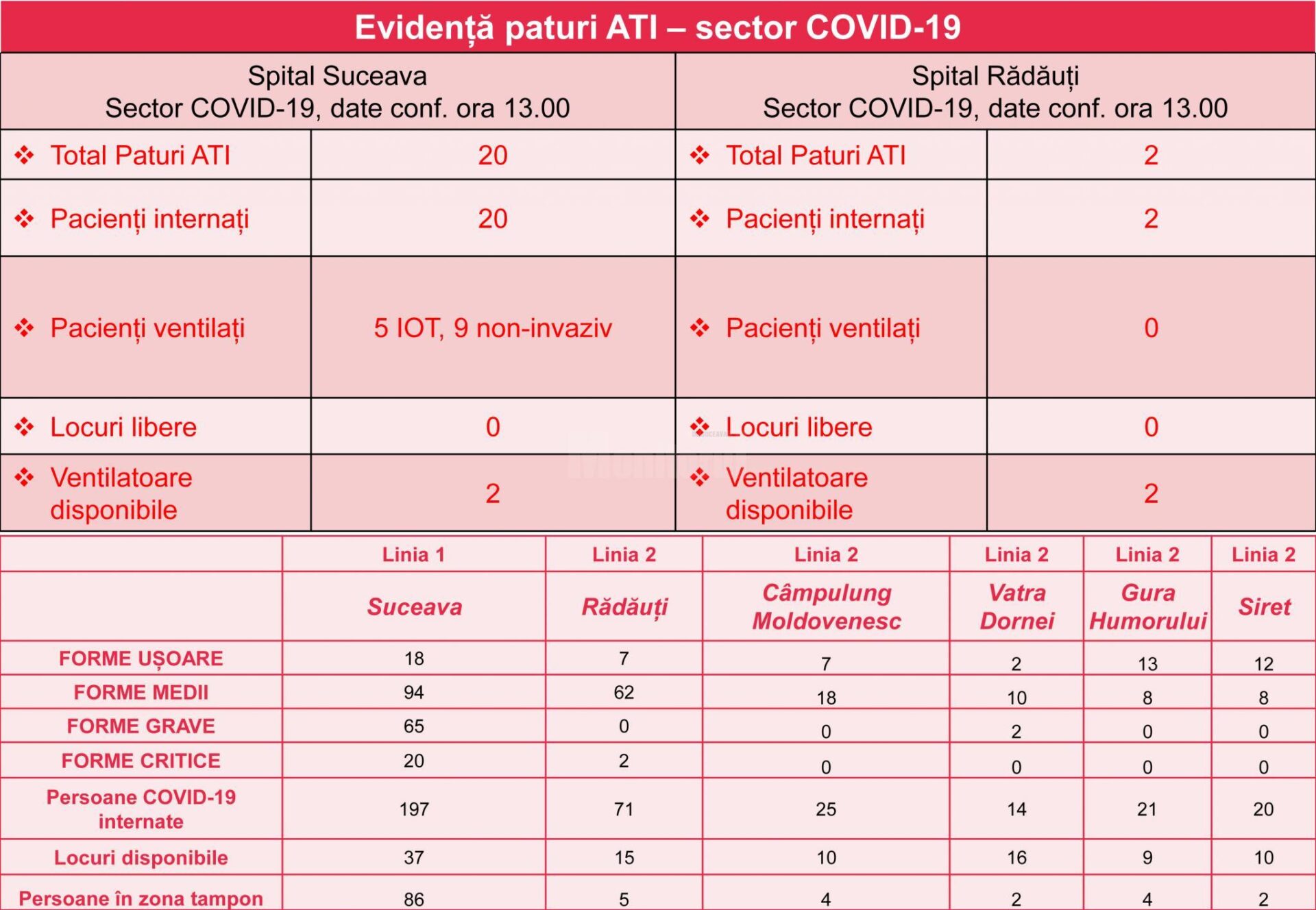 La Spitalul Municipal Rădăuți sunt internați 71 de pacienți diagnosticați cu Covid-19 și 5 persoane suspecte de infecție cu noul coronavirus; la Câmpulung Moldovenesc – 25 de pacienți cu Covid-19 și 4 persoane suspecte de infecție; Vatra Dornei – 14 pacienți cu Covid-19 și două persoane suspecte de infecție ; Gura Humorului – 21 de pacienți cu Covid-19 și 4 persoane suspecte de infecție; Spitalul de Boli Cronice Siret – 20 de pacienți diagnosticați cu Covid-19 și 2 persoane suspecte de infecție cu noul coronavirus.