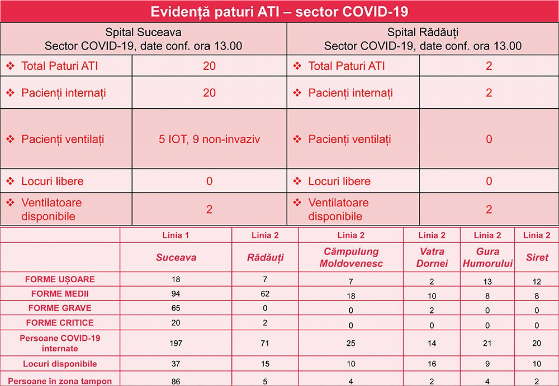 Spitalul Județean de Urgență „Sf. Ioan cel Nou” Suceava dispune, la această dată, de 374 de paturi libere, din care 37 pentru pacienți Covid-19, 225 în sectorul Non-Covid și 112 pentru zona tampon. La unitatea ATI nu este nici un pat disponibil pentru pacienți Covid. Sunt 28 de ventilatoare libere, din care 16 pentru pacienții Covid-19.