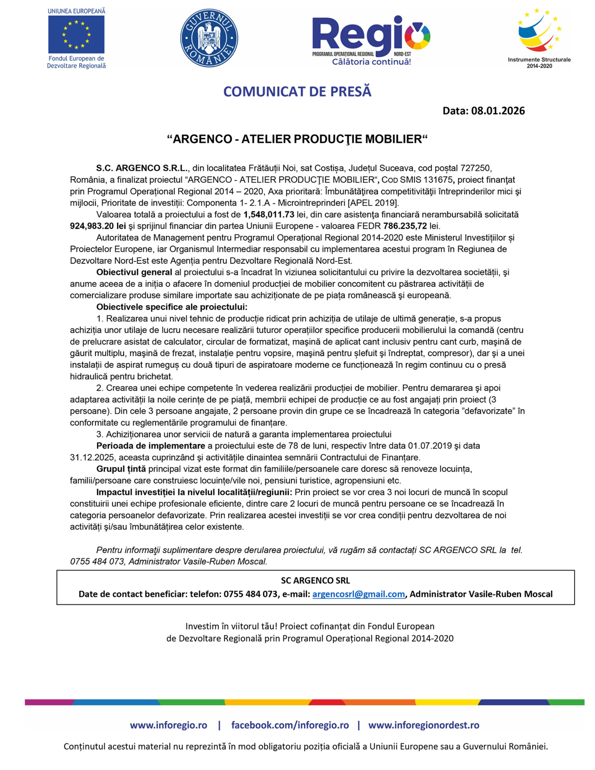S.C. ARGENCO S.R.L., din localitatea Frătăuții Noi, sat Costișa, Județul Suceava, cod poștal 727250, România, a finalizat proiectul “ARGENCO – ATELIER PRODUCŢIE MOBILIER“, Cod SMIS 131675, proiect finanţat prin Programul Operațional Regional 2014 – 2020, Axa prioritară: Îmbunătăţirea competitivităţii întreprinderilor mici şi mijlocii, Prioritate de investiții: Componenta 1- 2.1.A – Microintreprinderi [APEL 2019].