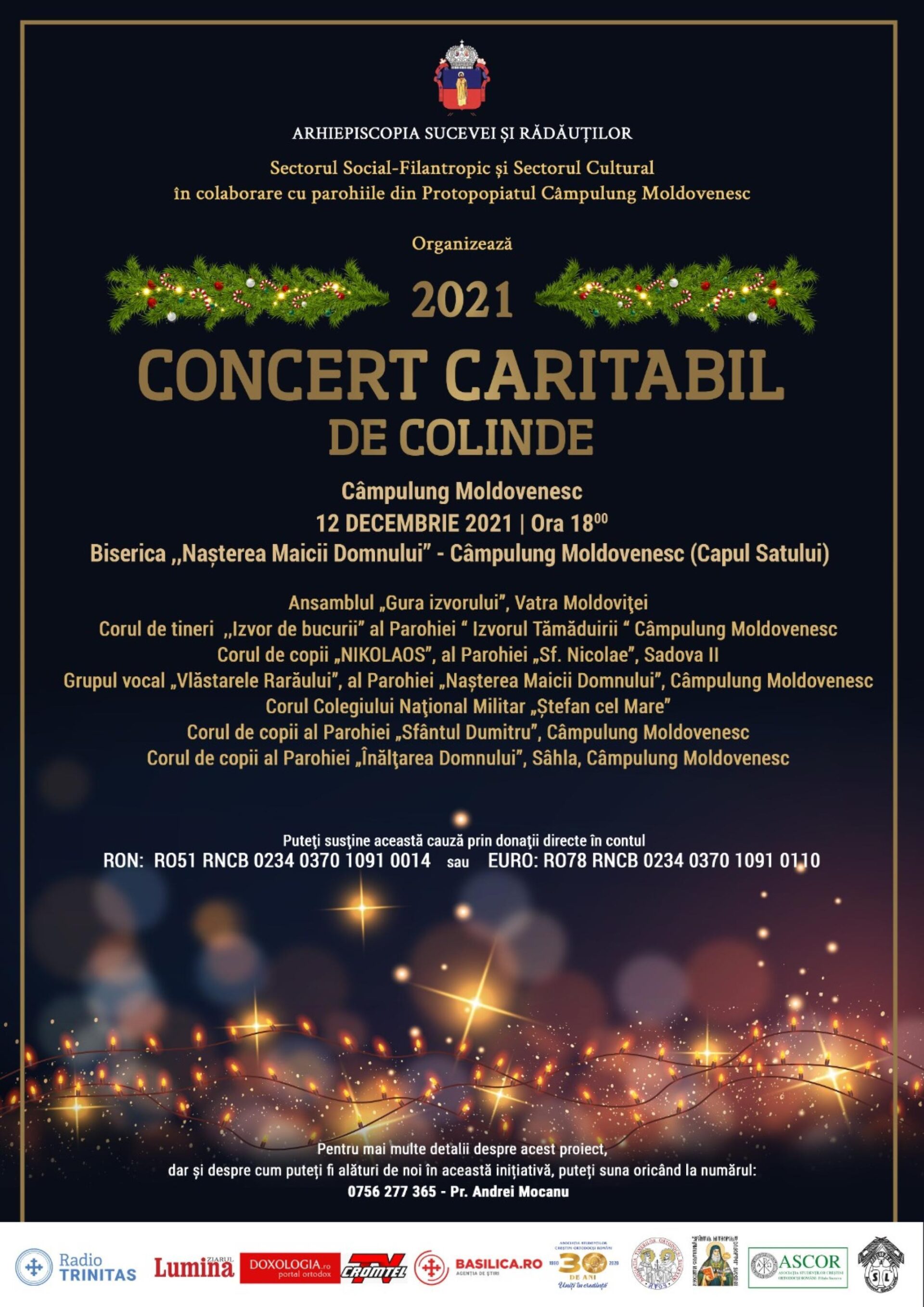 Sectorul Social-Filantropic al Arhiepiscopiei Sucevei și Rădăuților, în colaborare cu Sectorul Cultural și cu parohiile din Protopopiatul Câmpulung Moldovenesc, cu binecuvântarea Înaltpreasfințitului Părinte Calinic, Arhiepiscop al Sucevei și Rădăuților, organizează duminică, 12.12.2021, începând cu ora 18:00, în incinta Bisericii „Nașterea Maicii Domnului” din Câmpulung Moldovenesc, concertul caritabil de colinde, eveniment din cadrul proiectului „Un Crăciun pentru fiecare”, ediția a II-a. Organizatorii au transmis că acest concert va fi organizat atât din dorința de a promova corurile, grupurile vocale și ansamblurile de cântec și tradiții din Bucovina, cât și în scop caritabil, pentru a susține financiar proiectul „Un Crăciun pentru fiecare”, ediția a II-a.