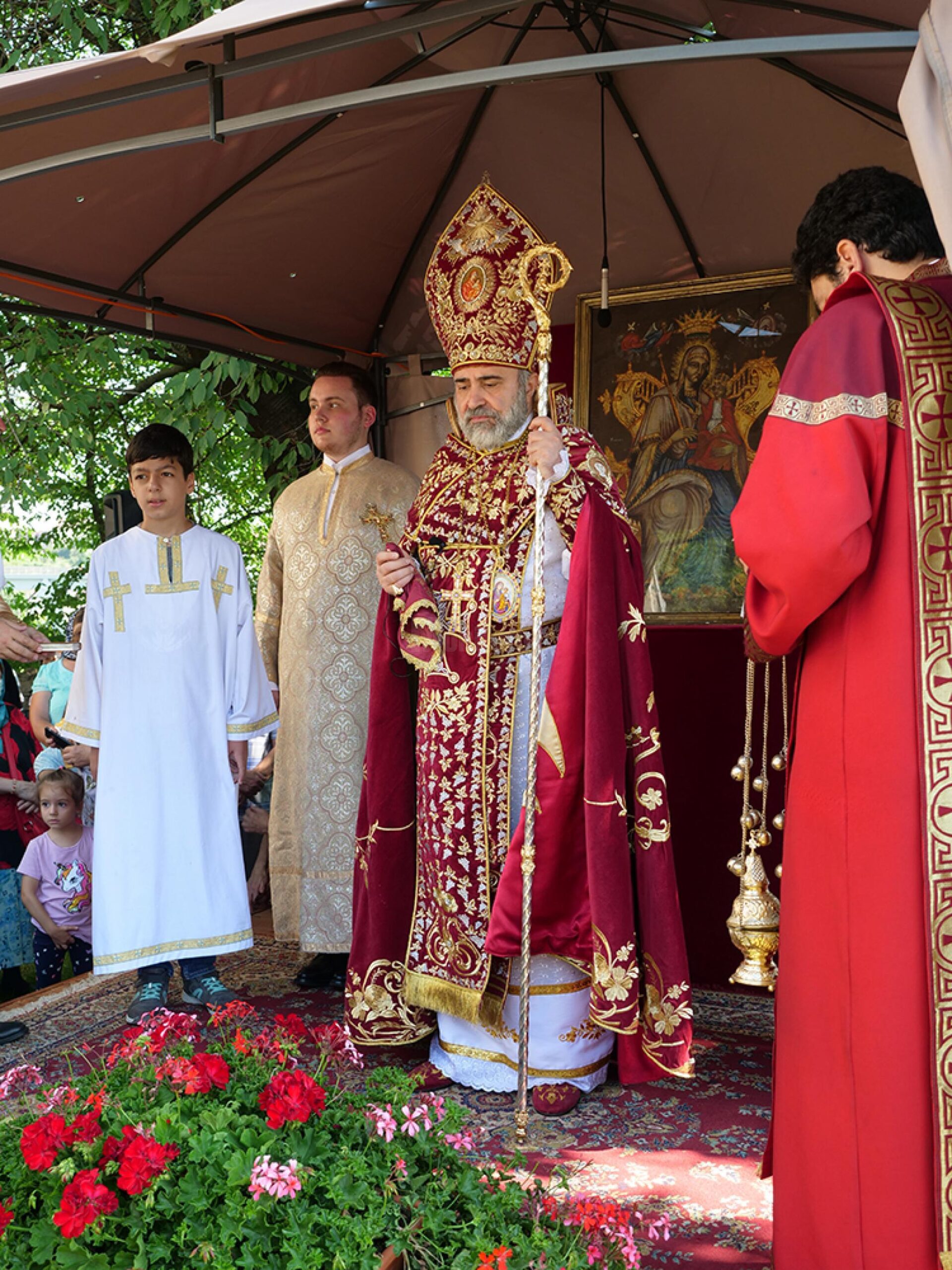 ”Iubiți credincioși, slăvesc pe Dumnezeu că ne-a îngăduit astăzi să ne aflăm în sfânta această biserică și vreau să mulțumesc autorităților locale prezente și credincioșilor armeni veniți astăzi aici din toată România. Bucuria e și mai mare pentru că ne aflăm aici și prăznuim anul acesta 500 de ani de la târnosirea bisericii «Sfânta Cruce». Această biserică a fost construită de ctitori care au făcut posibilă ridicarea lăcașului cu harul și ajutorul lui Dumnezeu. Ușile acestei biserici au fost deschise pe parcursul acestor cinci veacuri pentru credincioșii armeni și români din România. Vreau să vă mulțumesc iubiți credincioși pentru că împreună am reușit să ținem vie biserica și sper ca în această biserică să se audă veșnic rugăciunea armenească, rugăciunile noastre fiind înălțate către Hristos”.