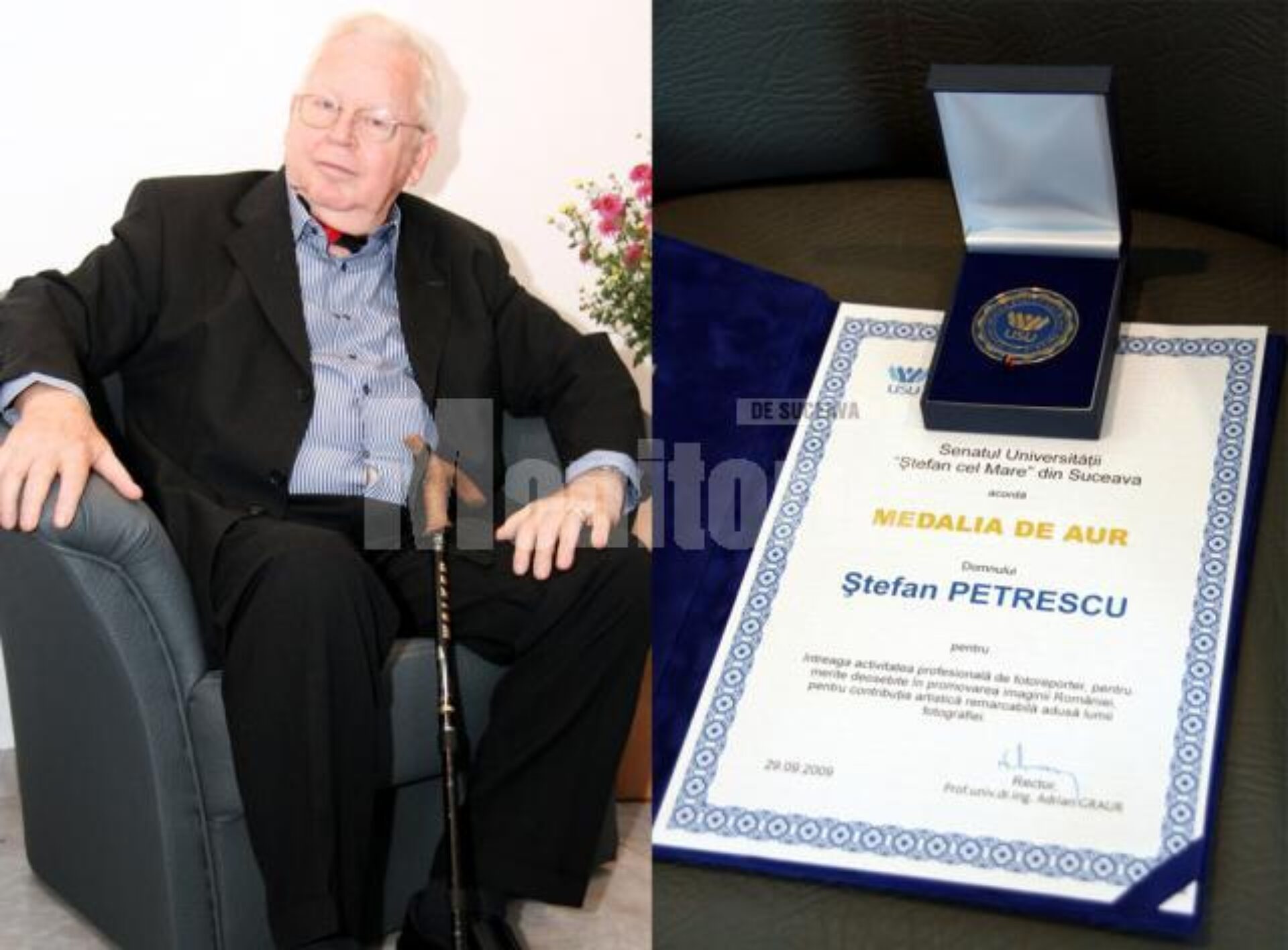 Venerabilul artist fotograf Ștefan Petrescu a fost onorat ieri, la Universitatea „Ștefan cel Mare”, cu diploma și medalia de aur a instituției de învățământ superior sucevene „pentru întreaga activitate profesională de fotoreporter, pentru merite deosebite în promovarea imaginii României și pentru contribuția artistică remarcabilă adusă lumii fotografiei”.