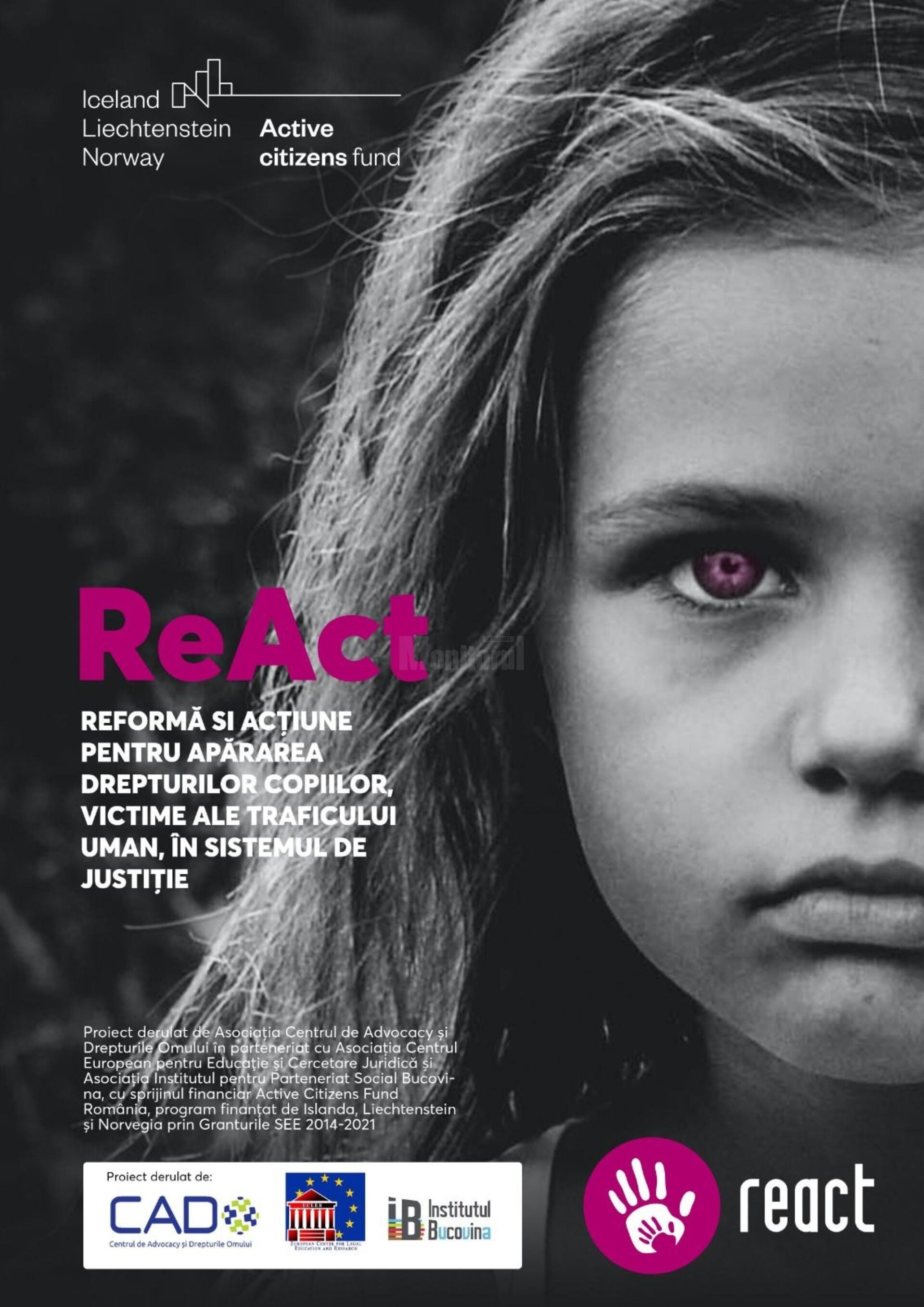 „ReACT – Reformă și acțiune pentru apărarea drepturilor copiilor, victime ale traficului uman, în sistemul de justiție penală” este un proiect derulat de Centrul de Advocacy și Drepturile Omului (CADO), în parteneriat cu Asociația Centrul European pentru Educație și Cercetare Juridică (ECLER) și Asociația Institutul pentru Parteneriat Social Bucovina (IPSB), cu sprijinul financiar Active Citizens Fund România, program finanțat de Islanda, Liechtenstein și Norvegia prin Granturile SEE 2014-2021. Scopul proiectului este îmbunătățirea statutului minorilor ca victime ale traficului uman în sistemul de justiție penală prin acțiuni de watchdog, de advocay de modificare a cadrului legislativ, de conștientizare a victimelor/potențiale victime, a profesioniștilor privind drepturile copiilor în sistemul de justiție penală și de pregătire a profesioniștilor din sistemului judiciar și social privind aplicarea legislației naționale și europene privind drepturile copiilor, victime ale traficului, în sistemul judiciar.