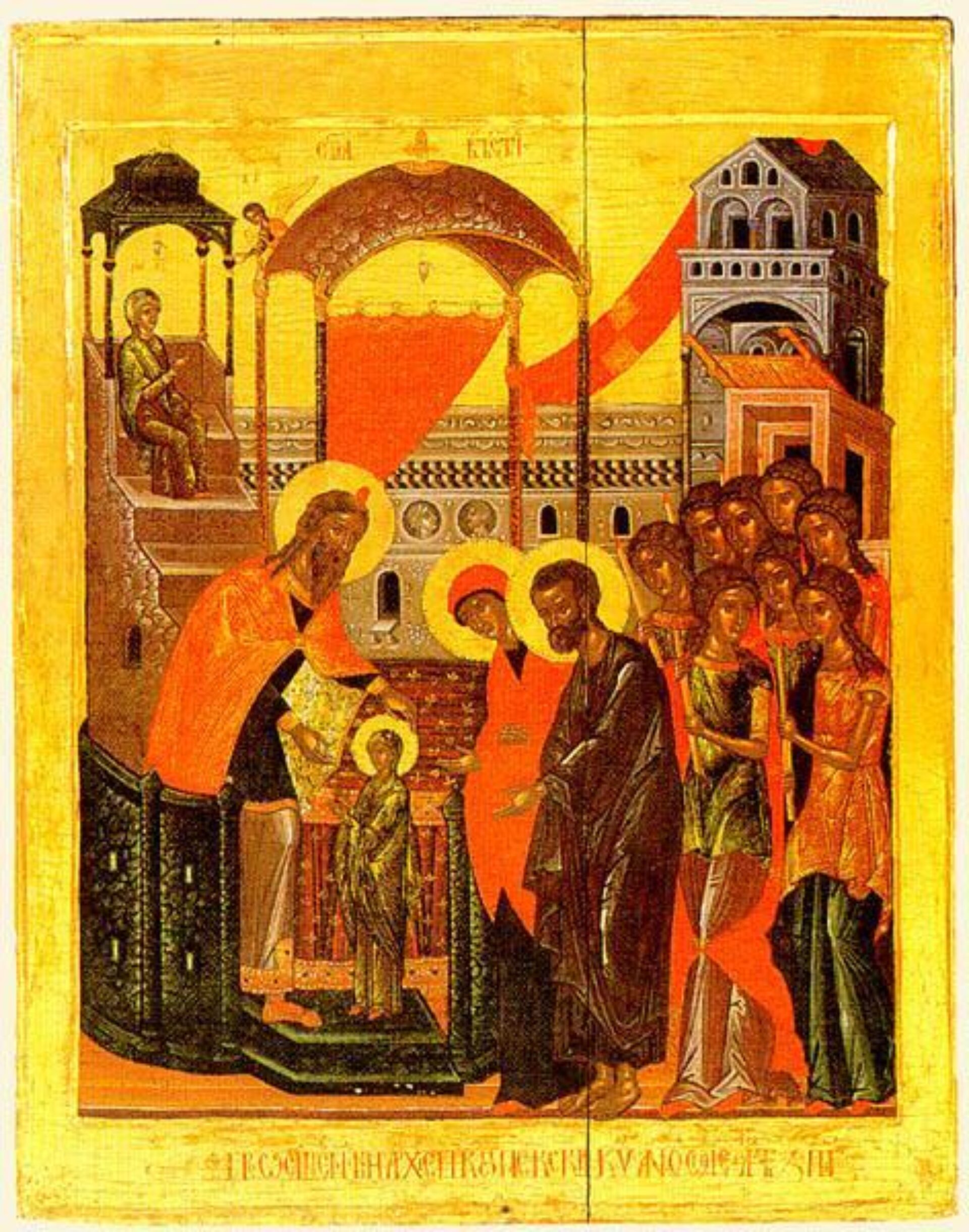 Fecioara avea pe atunci numai trei ani și a urcat singură toate cele 15 trepte abrupte ale Templului spre surprinderea numeroaselor rude prezente la acest eveniment. A rămas acolo vreme de 12 ani, ducând o viață sfântă și curată. La 15 ani a părăsit lăcașul și, potrivit datinii, a fost logodită cu dreptul Iosif, un bărbat din neamul lor, tâmplar de meserie, în vârstă de 84 de ani.