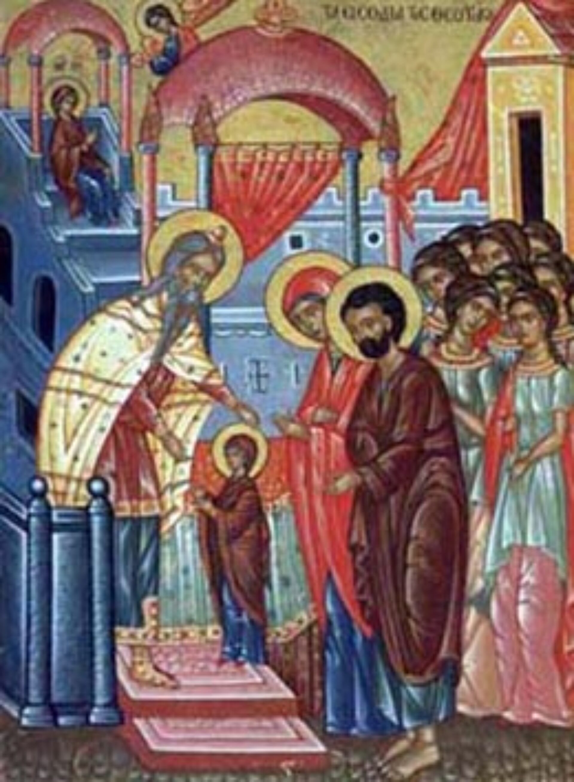 Astăzi Fecioara Maria a fost adusă la Ierusalim, în biserica Domnului să se roage, să vorbească cu Dumnezeu și cu îngerii, să se îndumnezeiască, să se facă biserica vie a Duhului Sfânt, să se pregătească pentru a naște pe pământ pe Iisus Hristos, Mântuitorul lumii.