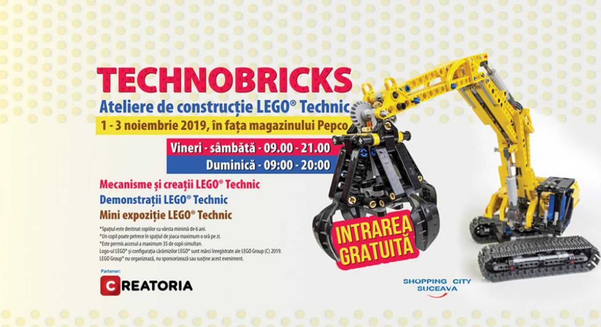 Copiii pasionații de cărămizile Lego sunt invitați la Shopping City Suceava, în perioada 1-3 noiembrie 2019, să descopere fascinanta lume a creațiilor Lego, în cadrul atelierelor de construcție TECHNOBRICKS.
