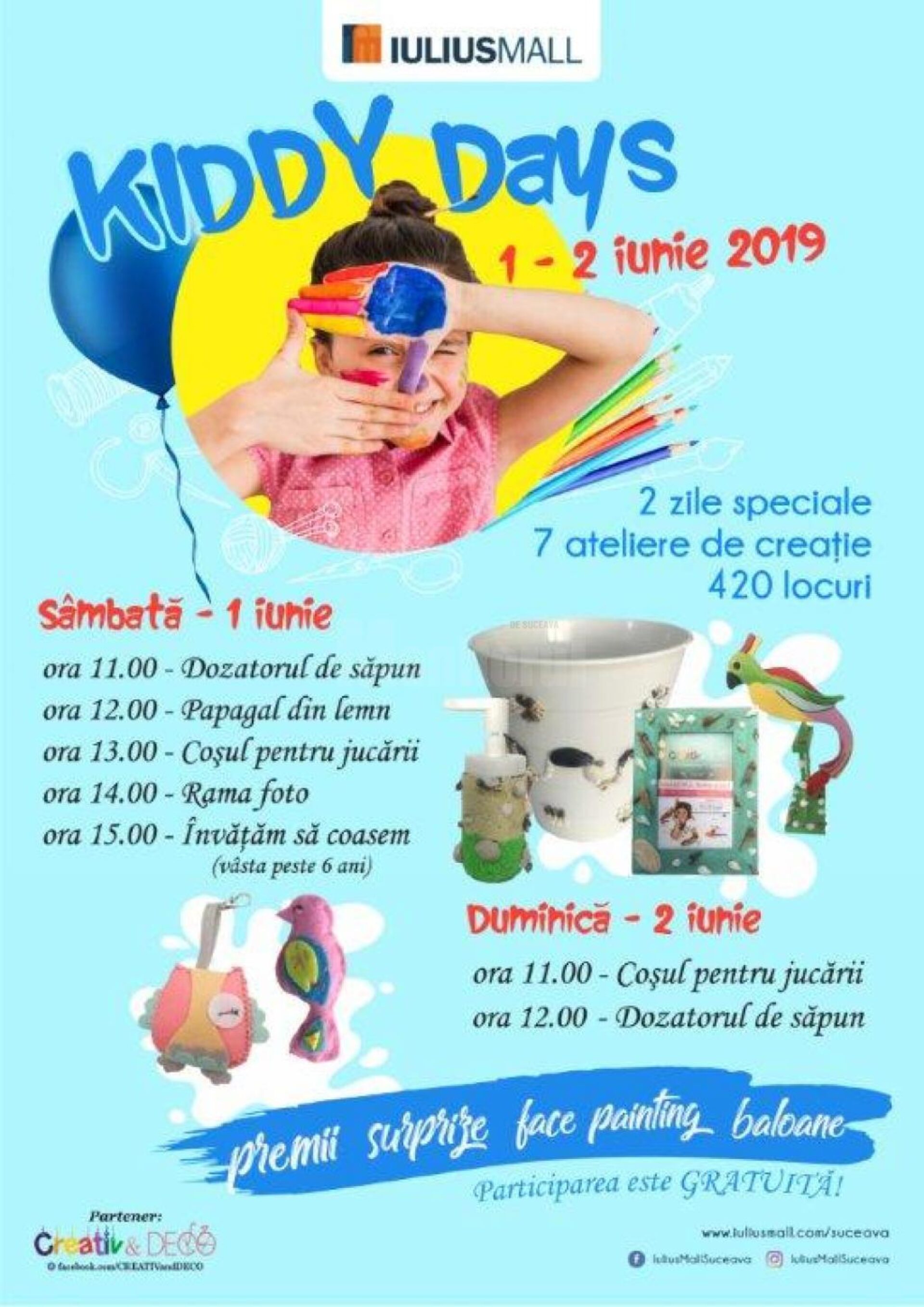 Luna iunie stă sub semnul copilăriei, așa că primul weekend din Cireșar este dedicat celor mici, la Iulius Mall. Sâmbătă, pe 1 iunie, maratonul distracției începe la ora 11.00, cu prima sesiune a atelierelor de creație susținute de Creativ & Deco, în cadrul cărora prichindeii vor realiza un dozator de săpun din plastilină 5D. De la ora 12.00, ștrengarii care iubesc prietenii necuvântători vor putea colora și decora un papagal de lemn. În următoarea sesiune creativă, de la ora 13.00, copiii vor face un coș pentru jucării, astfel încât camera lor să fie mereu curată. Iar pentru a păstra o amintire de Ziua Copilului, fotografia preferată va putea fi pusă în rama foto meșteșugită la întâlnirea de îndemânare și imaginație de la ora 14.00. Ultima activitate de sâmbătă, de la ora 15.00, este recomandată copiilor cu vârsta de peste cinci ani, care învață cusutul pe diferite figurine amuzante. Și duminică, 2 iunie, va fi zi cu distracție pentru năzdrăvani, atunci când sunt programate alte două ateliere de creație: de la ora 11.00 – modelaj cu plastilină 5D, iar de la ora 12.00 – confecționare coș de jucării. Sâmbătă, în intervalul 11.00 – 16.00, și duminică, între orele 11.00 și 13.00, cei mici vor avea parte și de alte activități interesante: face painting, jocuri cu baloane și alte surprize. În plus, de ziua lor, prichindeii vor fi întâmpinați cu premii dulci. Întreaga lună iunie Iulius Mall Suceava va fi locul ideal pentru a sărbători copilăria, pentru că, în fiecare duminică, cei mici primesc invitație la teatru. „Frumoasa din Pădurea Adormită”, „Aventuri cu domnul Goe” și „Jack și vrejul de fasole” sunt poveștile care îi vor conduce în universul fascinant al imaginației.