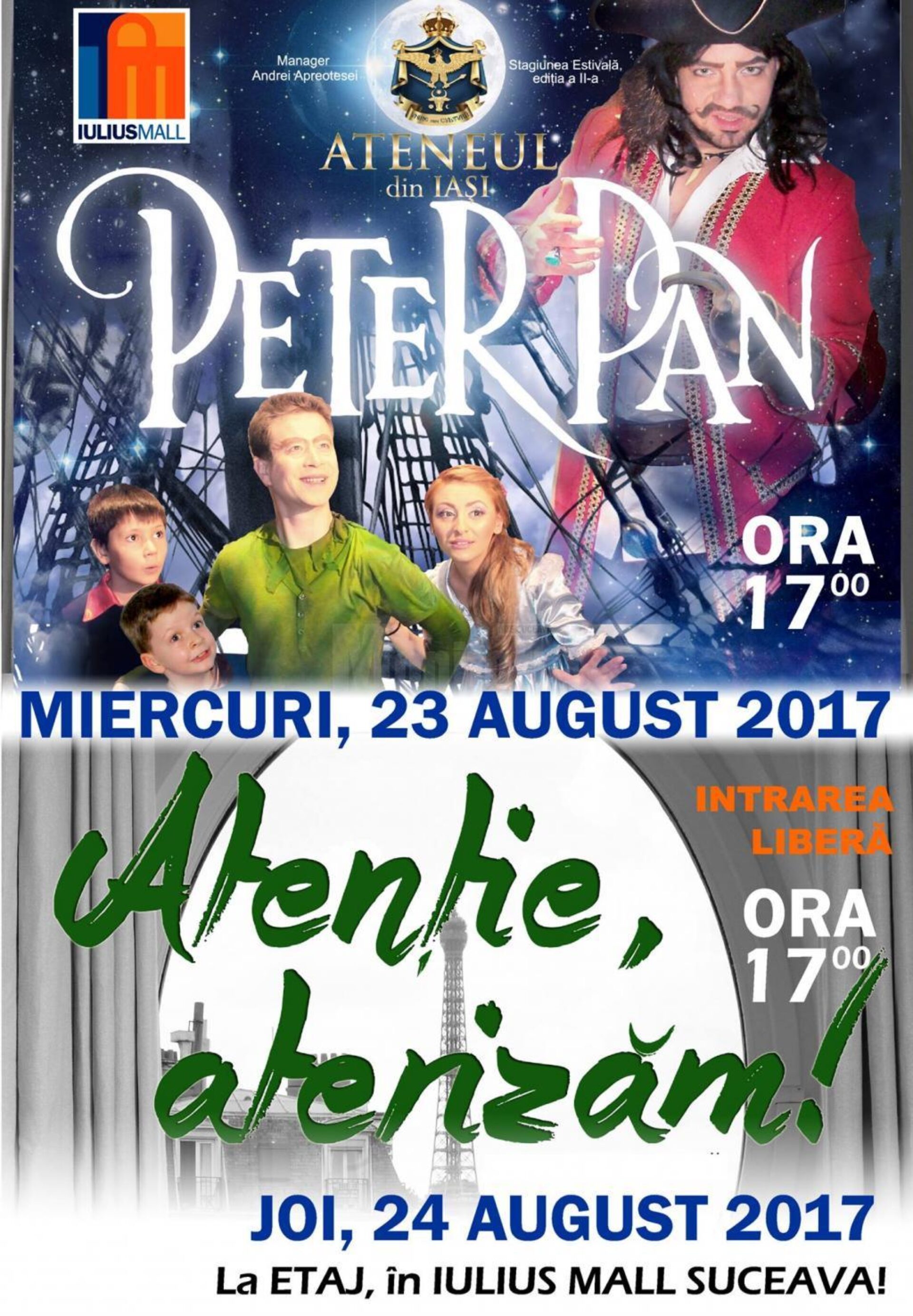 La Suceava, „Peter Pan” va avea loc miercuri, 23 august, de la ora 17.00, în complexul comercial Iulius Mall. Joi, 24 august, de la ora 17.00,artiștii vor prezenta spectacolul de teatru „Atenție, aterizăm!”, în regia Daniel Onoae, tot în complexul comercial Iulius Mall.