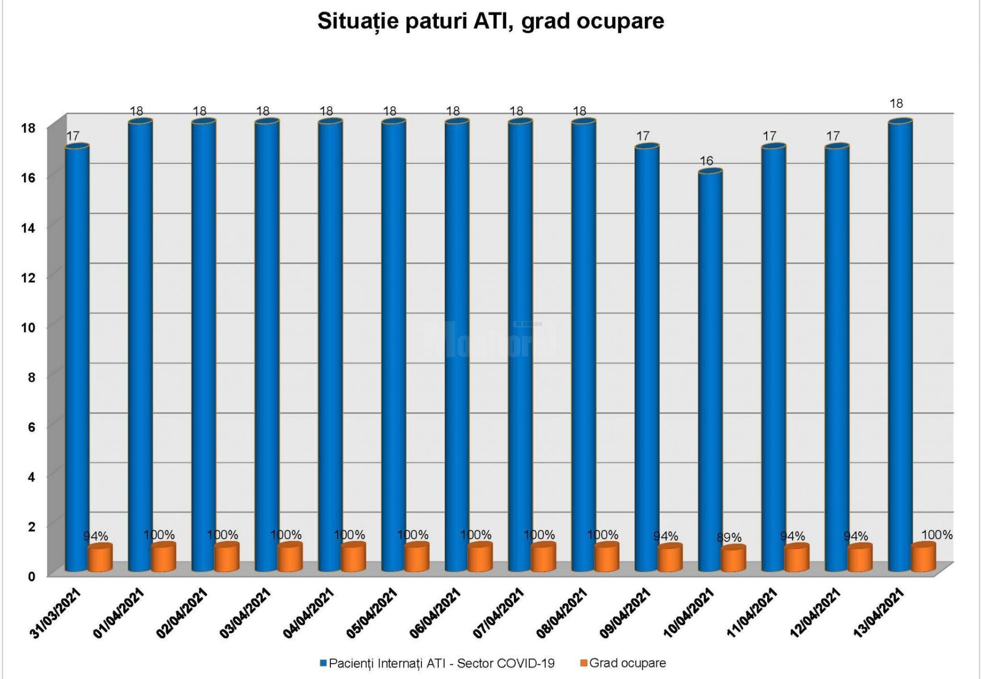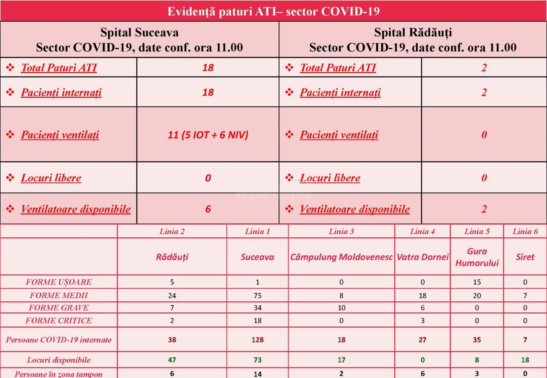 În Spitalul Județean de Urgență „Sf. Ioan cel Nou” Suceava sunt internați 128 de pacienți diagnosticați cu Covid-19, 14 pacienți în zona tampon și 390 de pacienți cu alte afecțiuni (non-Covid). 34 de pacienți cu Covid prezintă forme severe severe de boală, 18 au forme grave și sunt internați în secția ATI. Dintre aceștia 6 sunt ventilați non-invaziv și 5 sunt intubați ventilați invaziv. Spitalul Suceava dispune de 353 de paturi libere, din care 73 pentru pacienți Covid-19, 245 în sectorul non-Covid și 25 pentru zona tampon.