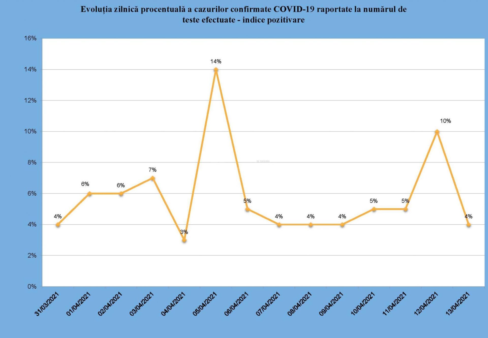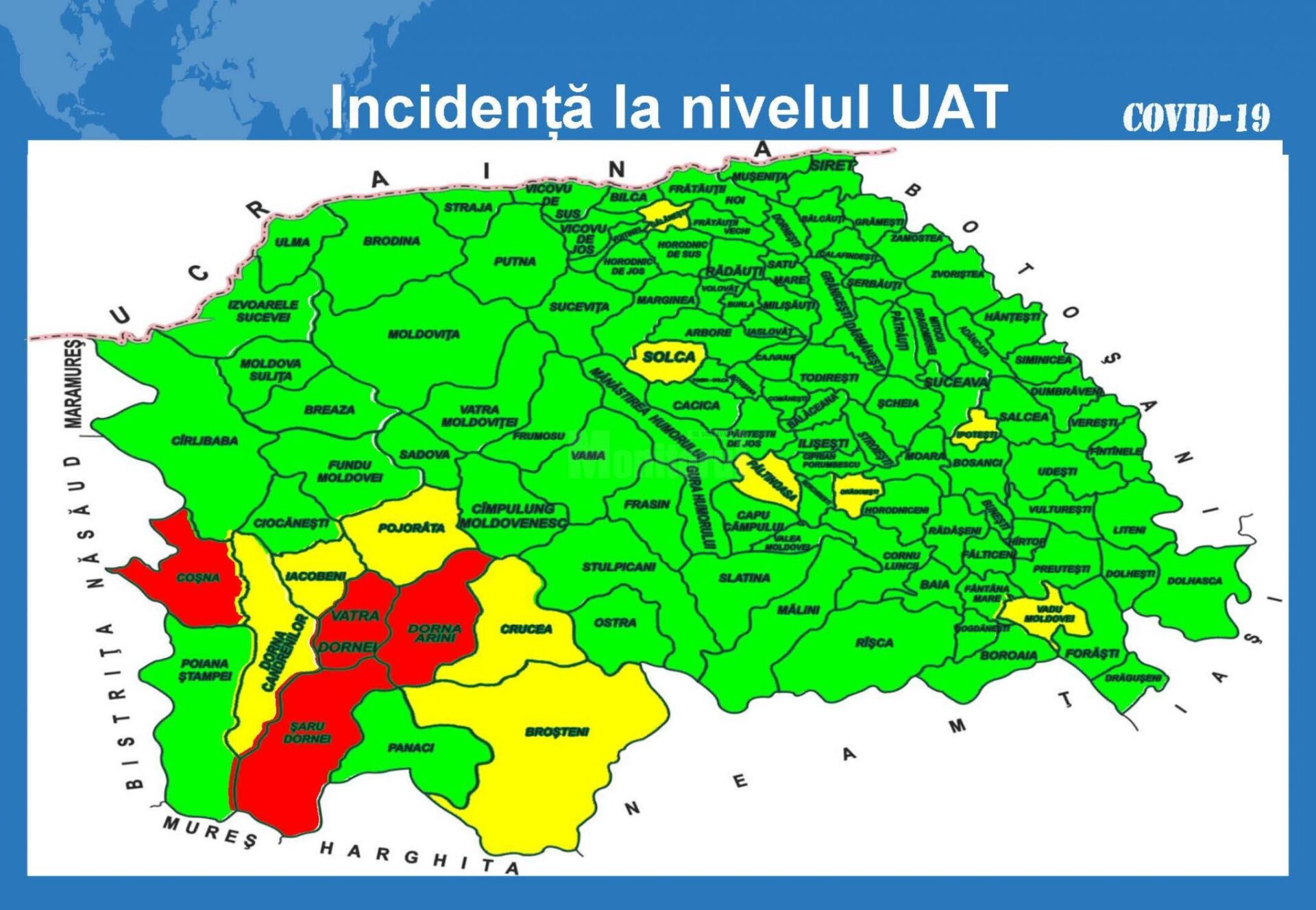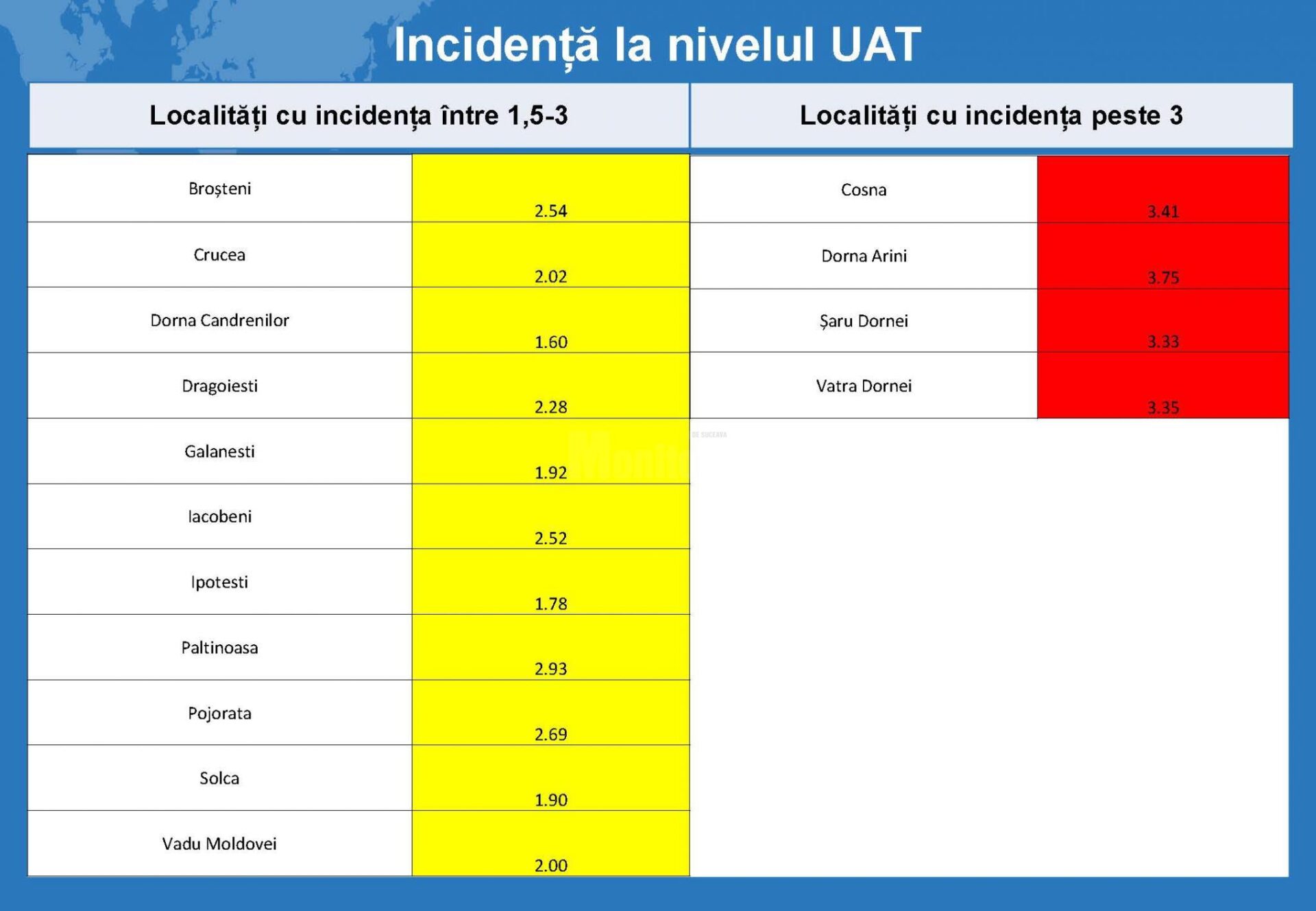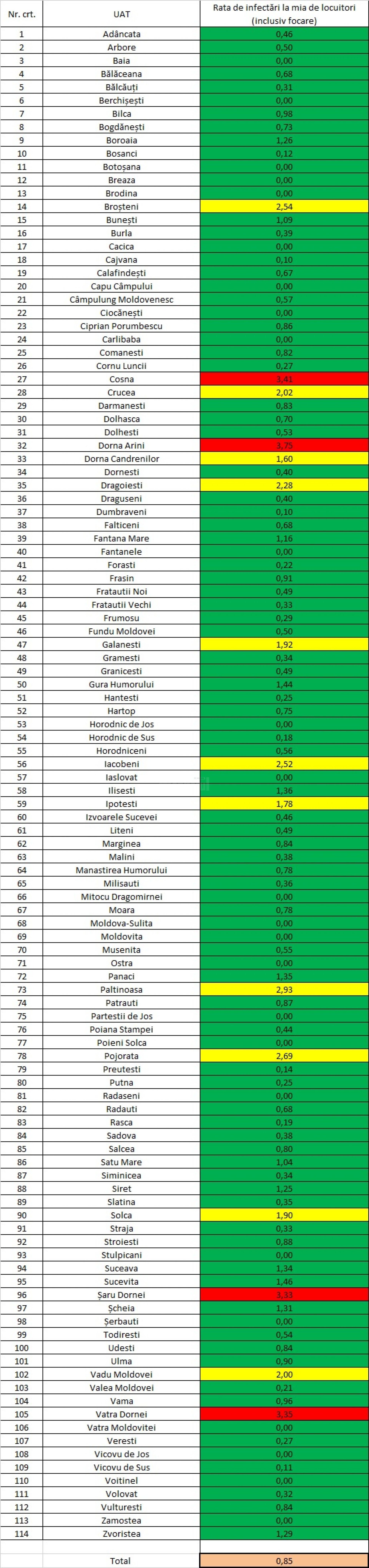 În municipiul Suceava incidența a scăzut la 1,34 la mie. Toate cele patru localități din județ care sunt în zona roșie sunt în Bazinul Dornelor: Vatra Dornei, cu incidență de 3,35 la mie, Șaru Dornei- 3,33 la mie, Dorna Arini – 3,75 la mie și Coșna – 3,41 la mie.
