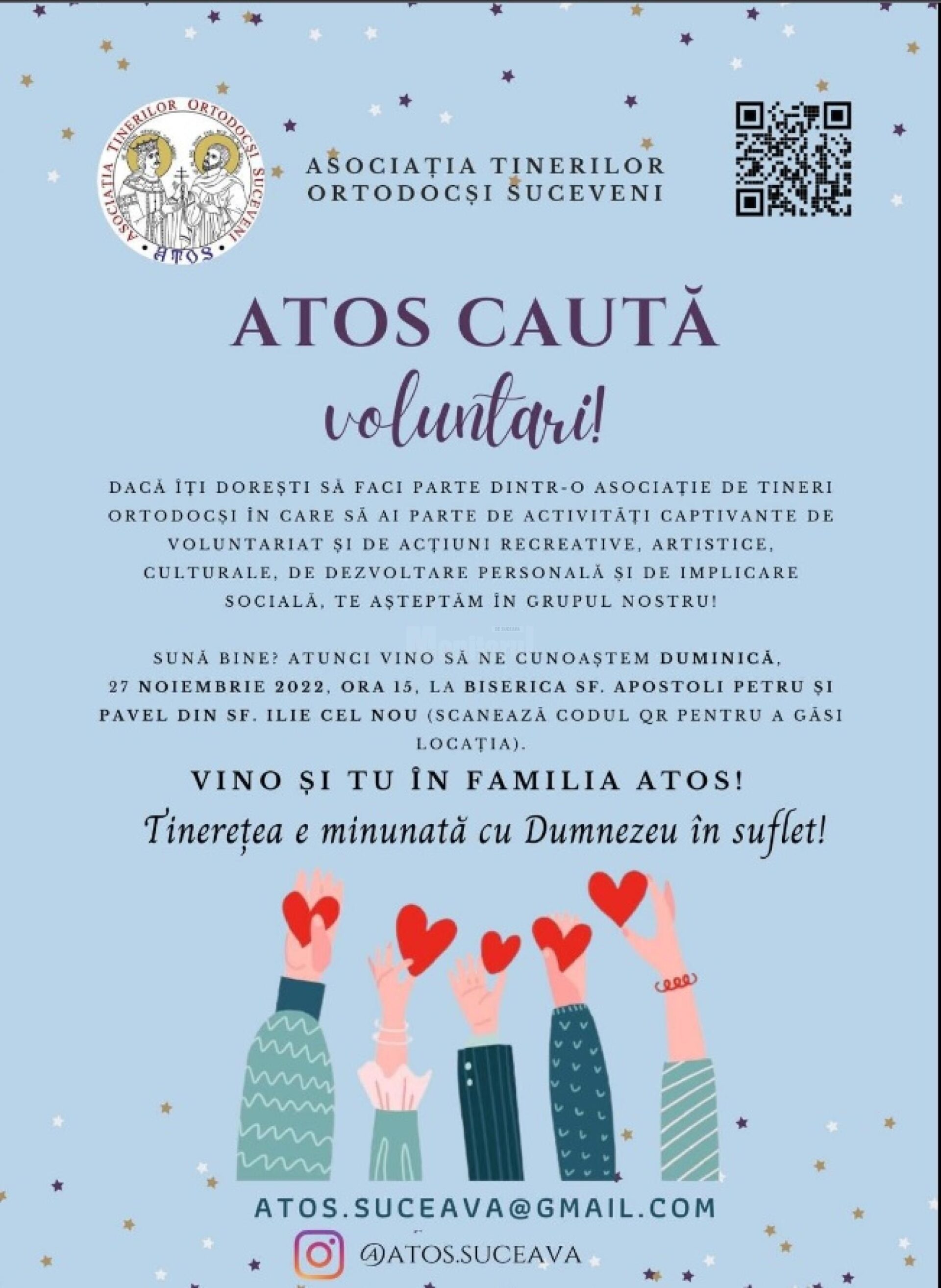 Asociația Tinerilor Ortodocși Suceveni caută voluntari. Persoanele interesate sunt așteptate duminică, 27 noiembrie 2022, la ora 15:00, la Biserica „Sf. Ap. Petru și Pavel” din Sfântu Ilie, Suceava. ”Dacă îți dorești să faci parte dintr-o asociație de tineri ortodocși în care să ai parte de activități captivante de voluntariat și de acțiuni recreative, artistice, culturale, de dezvoltare personală și de implicare socială, te așteptăm în grupul nostru!”, transmite Asociația Tinerilor Ortodocși Suceveni.