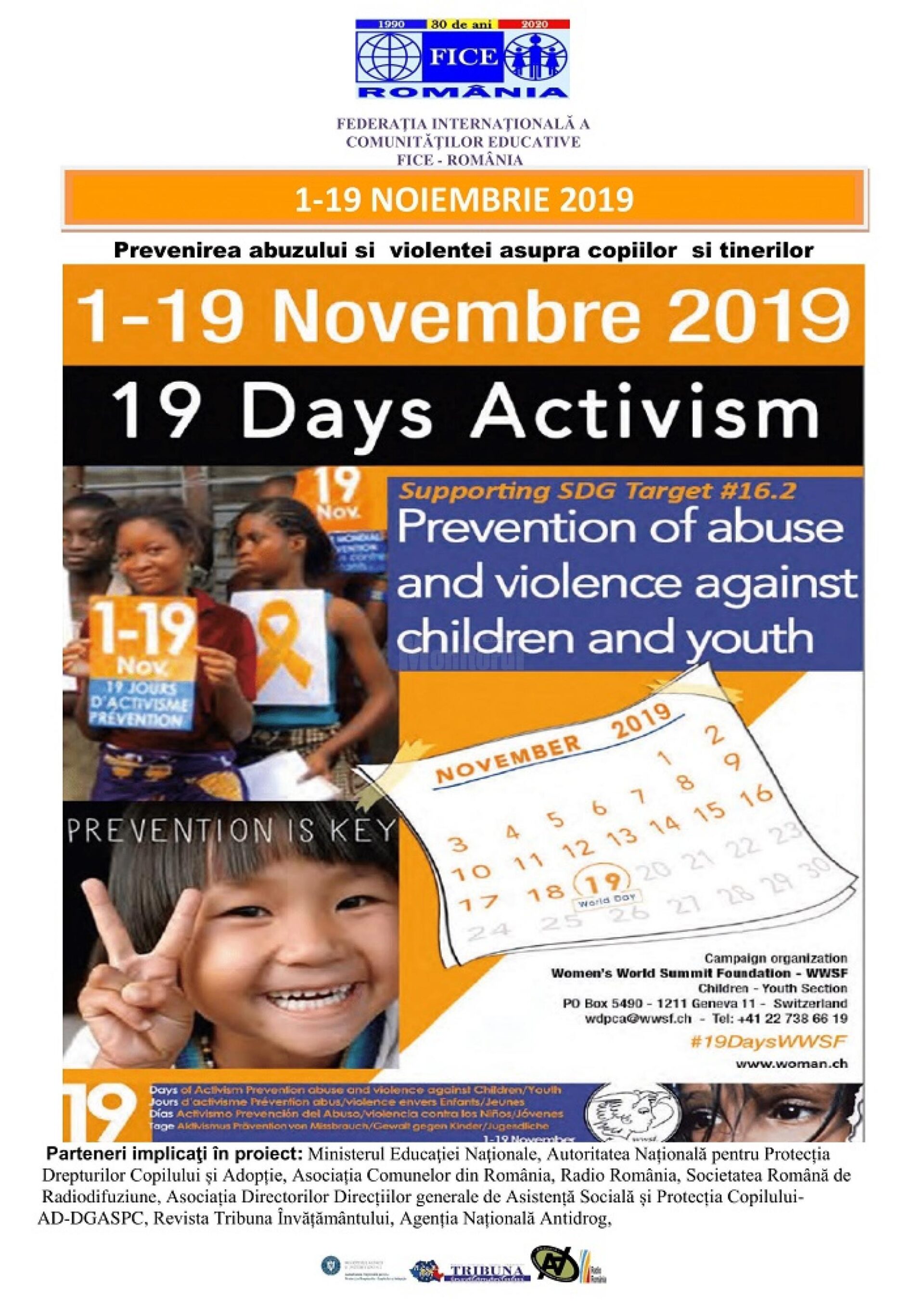 Au început înscrierile pentru Campania „19 zile de prevenire a abuzurilor și violențelor asupra copiilor și tinerilor”, care se va desfășura în unități de învățământ preuniversitar, centre de plasament, cluburi/palate ale copiilor, în perioada 1-19 noiembrie 2020. Înscrierea la acest proiect educațional nu este condiționată de plata vreunor taxe de participare și se realizează, pe baza fișei de înscriere, la adresa activism19zile@outlook.com, până pe 25 octombrie 2020.