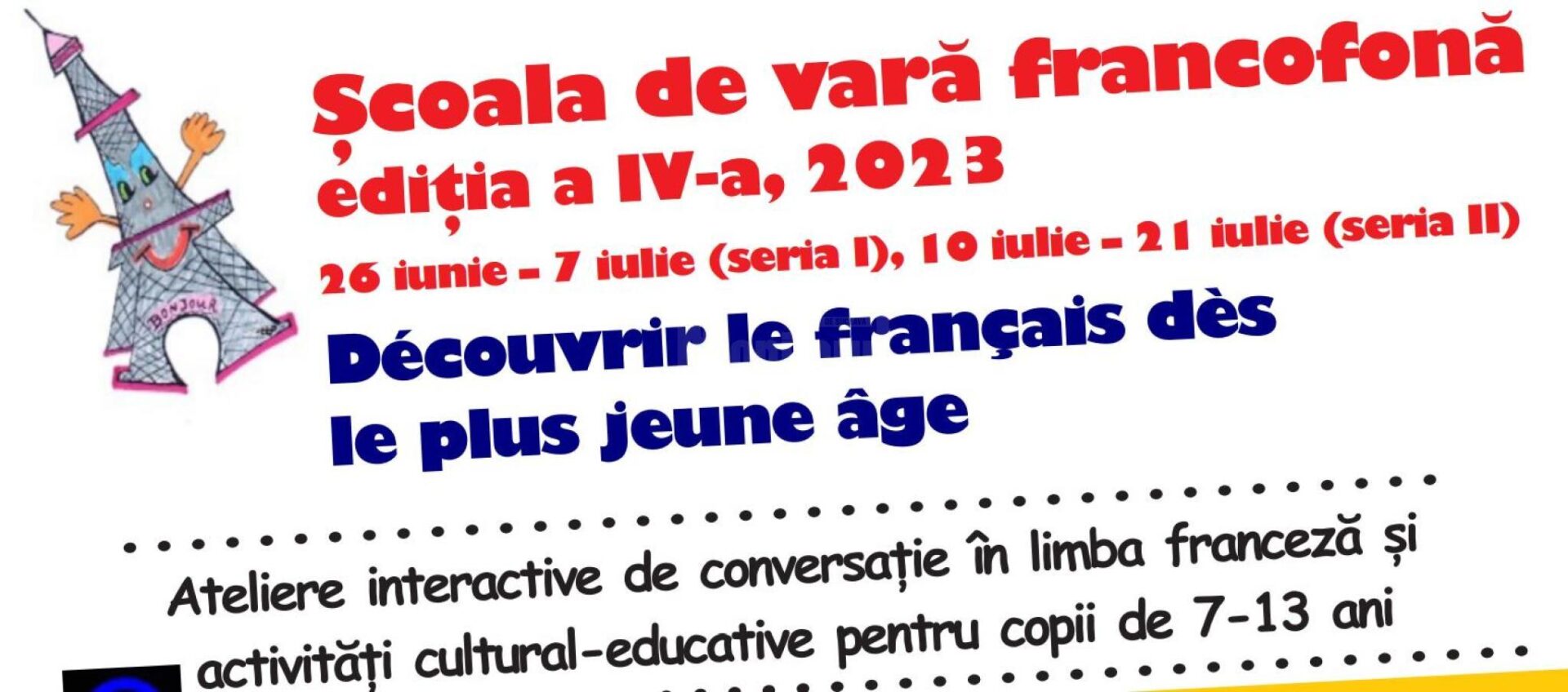 Școala de vară francofonă de la Suceava va avea două serii: 26 iunie – 7 iulie și 10 – 21 iulie 2023. Programul zilnic va fi între orele 8.30 – 14.00 și va cuprinde atât ateliere interactive de conversație în limba franceză, cât și activități cultural-educative destinate copiilor. Printre activitățile propuse menționăm ateliere de pictură, dans, muzică, bandă desenată, teatru, informatică, siguranța online.