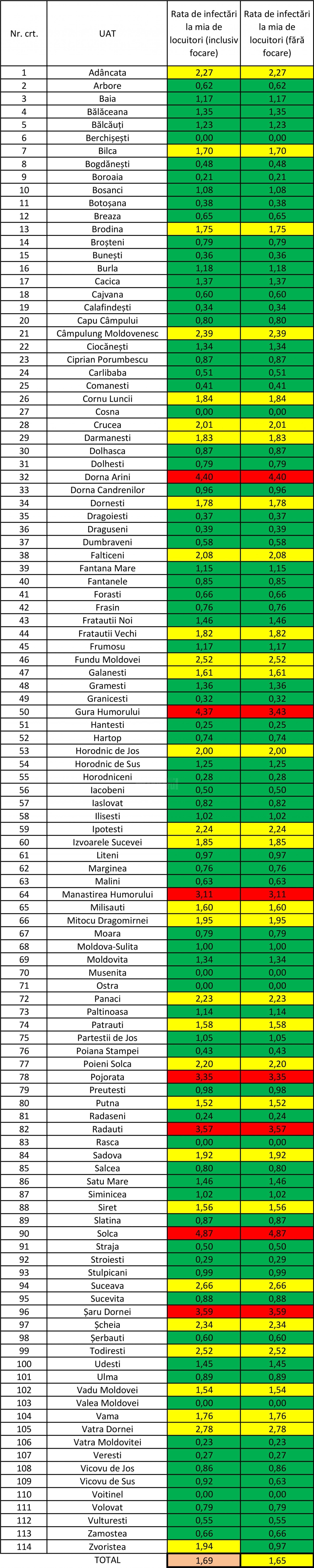 Șapte localități din județul Suceava sunt în continuare în zona roșie – un municipiu, două orașe și patru comune. Este vorba despre Rădăuți, unde incidența cazurilor pozitive este de 3,57 la mie, Gura Humorului, cu incidență de 4,37 cu cele două focare din casele pentru copii și 3,43 fără focare, Solca – incidență de 4,87 la mie, Dorna Arini – 4,40 la mie, Mănăstirea Humorului – 3,11 la mie, Pojorâta – 3,85 la mie și Șaru Dornei – 3,59 la mie.