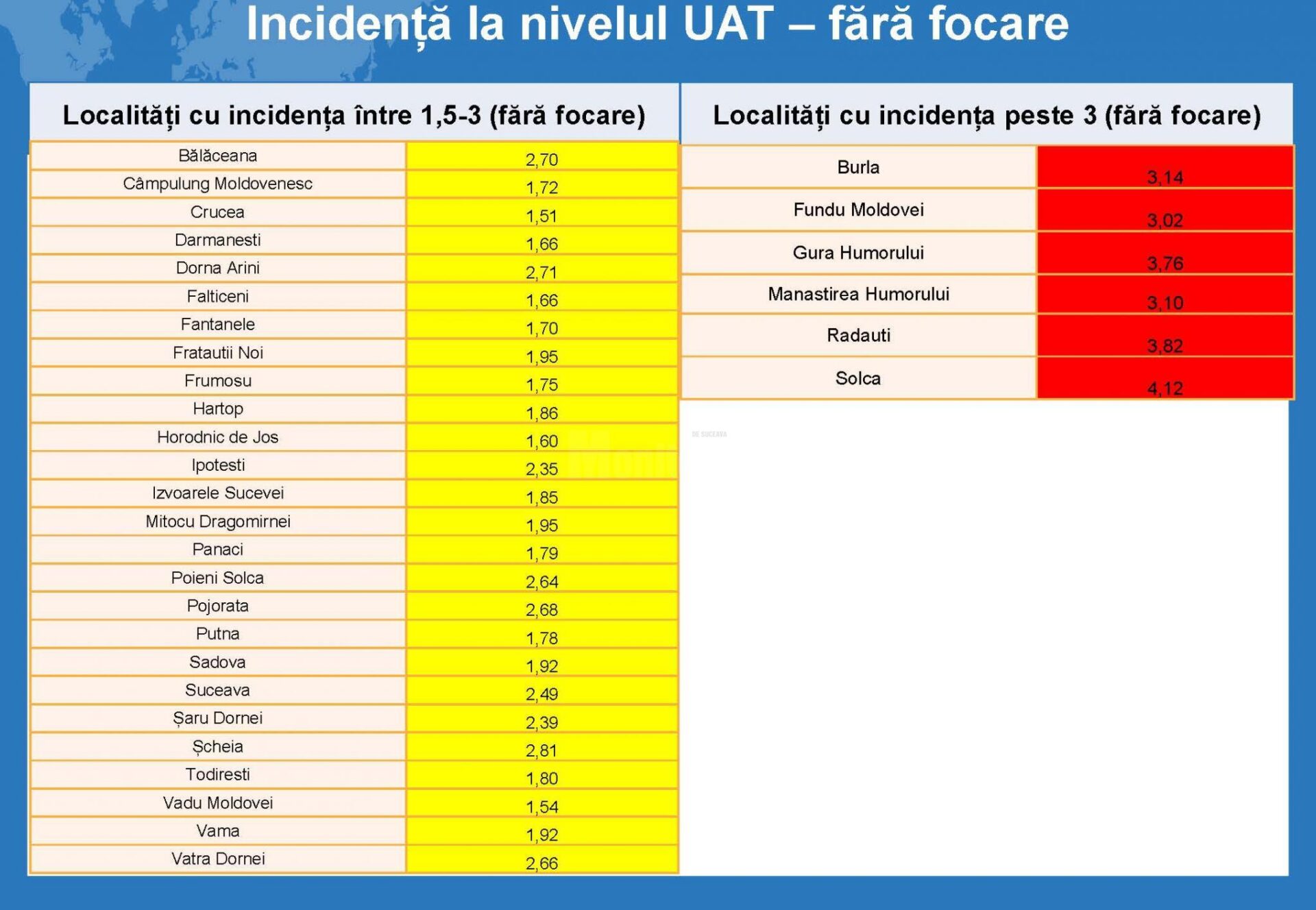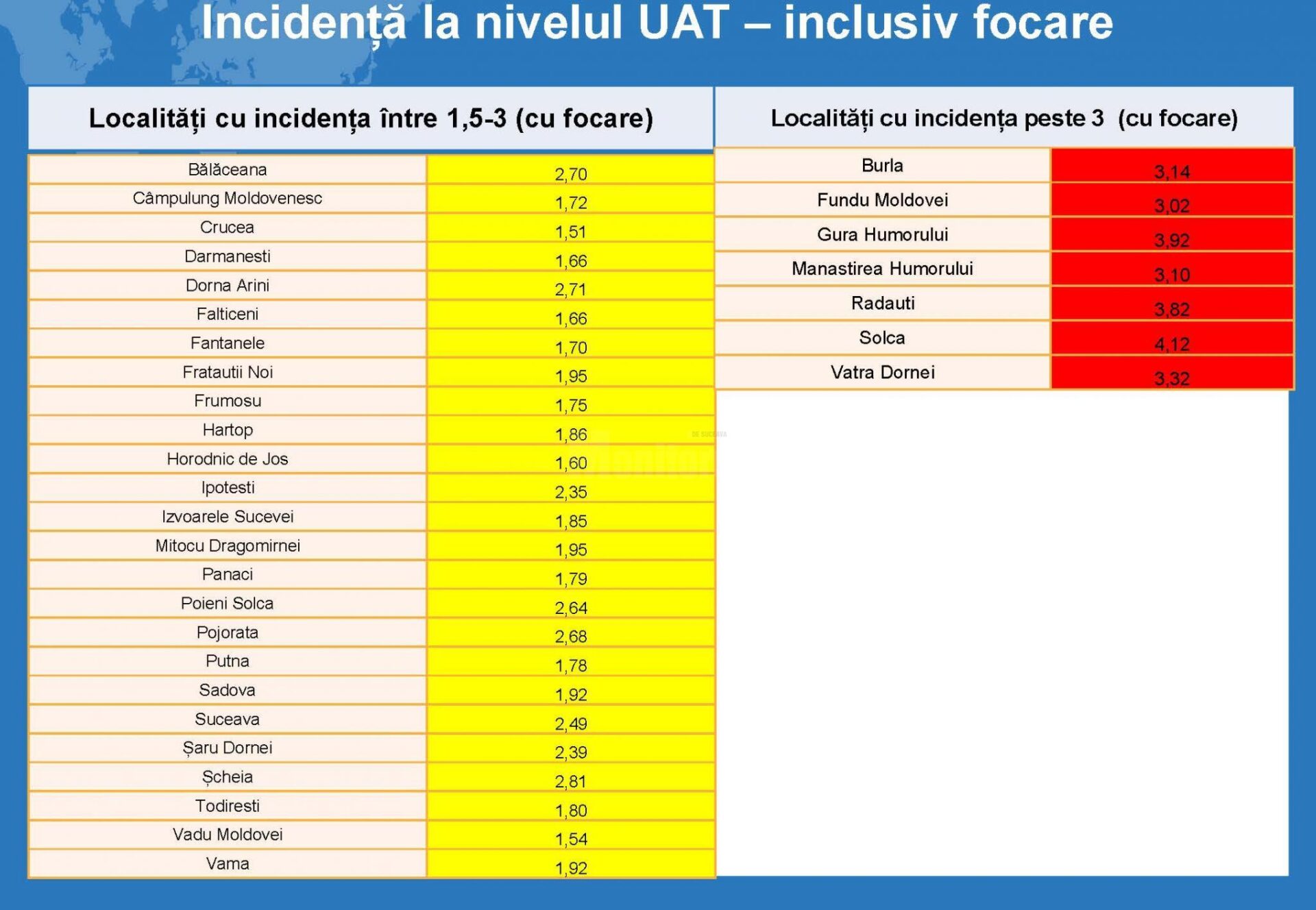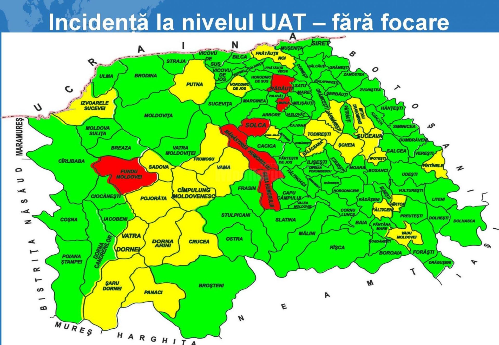 Conform distribuției cazurilor Covid-19 pe unități administrativ-teritoriale, din cele 114 unități administrativ-teritoriale 12 nu au niciun caz de infecție Covid-19 în evoluție, față de 10, în ziua anterioară. Alte 11 au câte un caz în evoluție, 39 au sub cinci cazuri în evoluție, 31 au sub zece cazuri în evoluție, iar 21 au peste zece cazuri în evoluție. Șapte localități sunt încă în zona roșie: Rădăuți, Vatra Dornei, Gura Humorului, Solca, Burla, Fundu Moldovei și Mănăstirea Humorului. Alte 25 sunt în zona galbenă. În județ sunt la această dată 4 focare: Casa de tip familial Orhideea Gura Humorului – 3 cazuri, CRRN Zvoriștea – 6 cazuri, Unitatea de Asistență Medico – Sanitară Vicovu de Sus – 3 cazuri și Centrul Social de Primire, Asistare și Îngrijire a Persoanelor Vârstnice Vatra Dornei, declarat focar pe 10 decembrie, 11 cazuri.