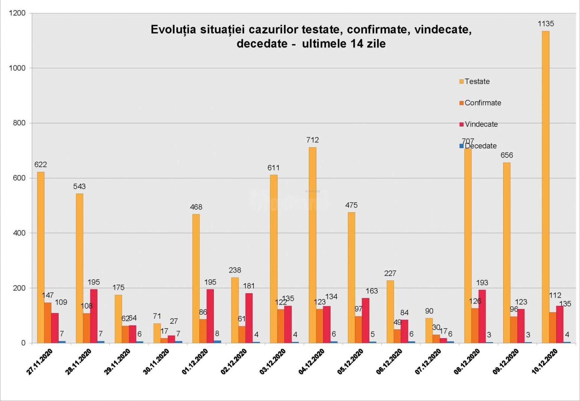 În privința testelor, față de acum 14 zile, numărul de persoane testate aproape s-a dublat, de la 622 în 24 de ore pe 27 noiembrie, la 1.135 persoane testate, raportate pe 10 decembrie. Indicele de pozitivare a avut un vârf în data de 23 noiembrie, de 38%, iar pe 10 decembrie a ajuns la 9%.