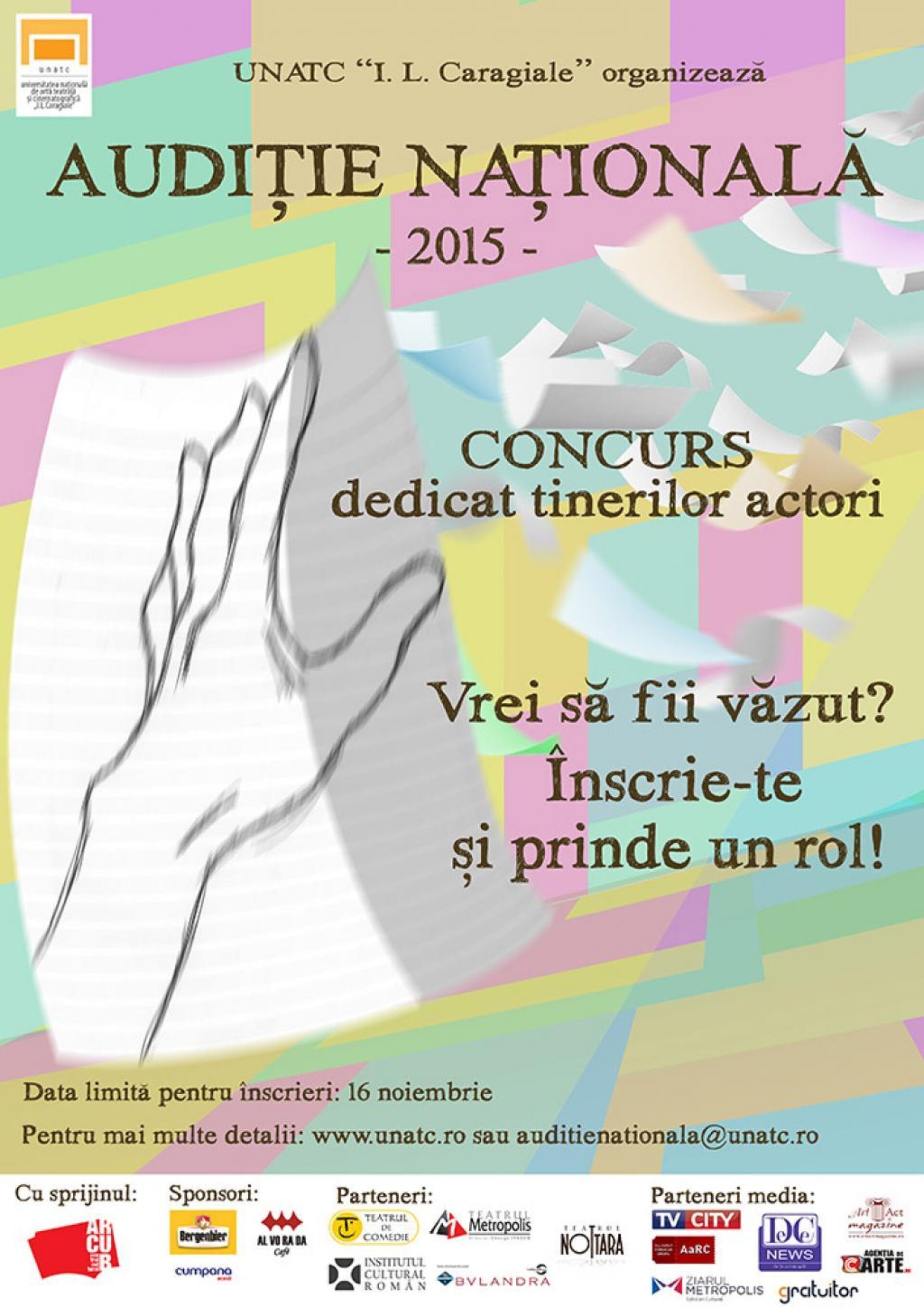 Universitatea Națională de Artă Teatrală și Cinematografică (UNATC) „I.L. Caragiale“ anunță deschiderea înscrierilor pentru cea de-a III-a ediție a Audiției Naționale – Concurs dedicat tinerilor actori și studenților din ultimul an de studiu, specializarea Arta Actorului, de la toate universitățile din țară, de stat și private.