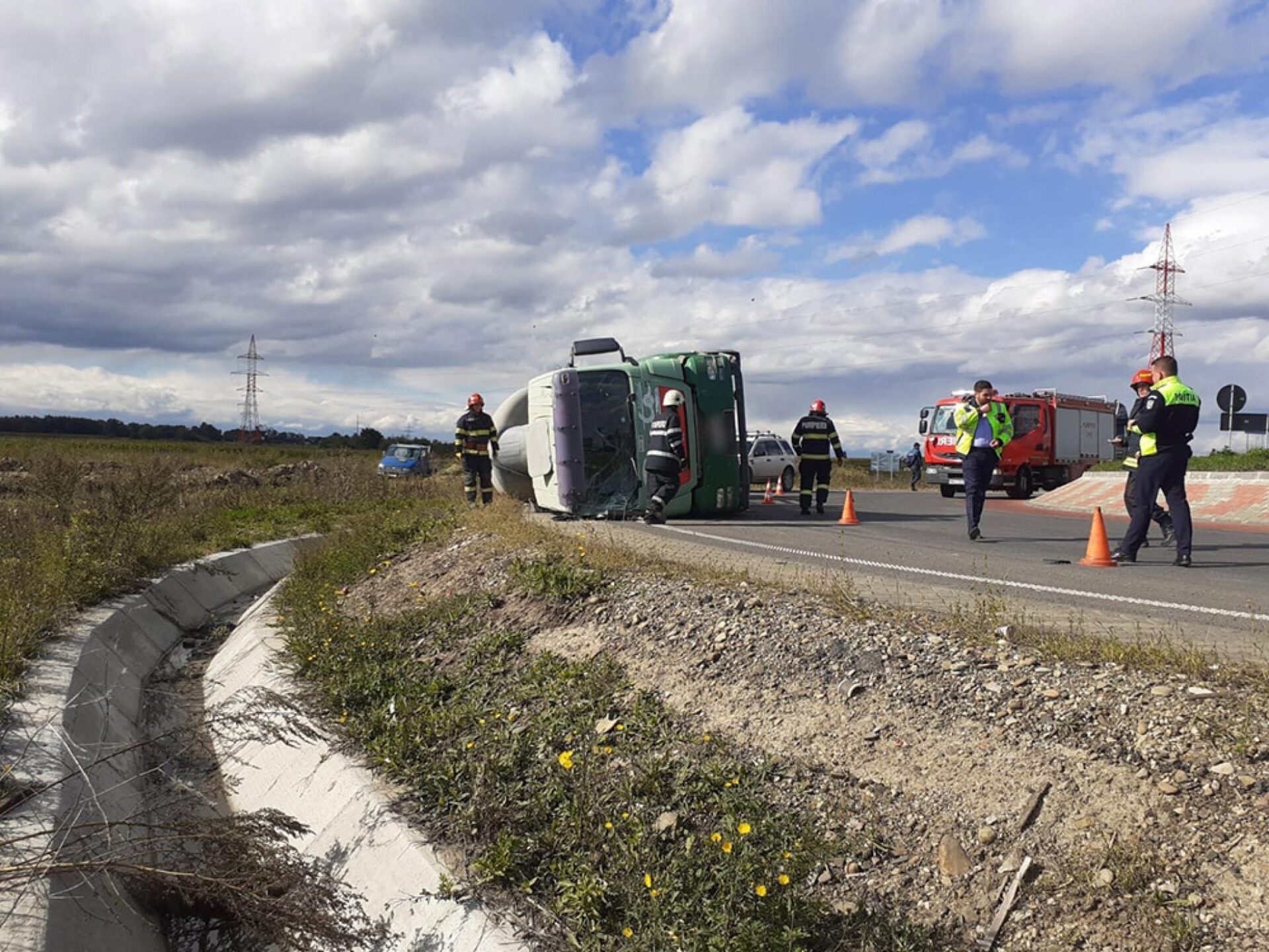 O autobetonieră scăpată de sub control de șofer s-a răsturnat în sens giratoriu, în municipiul Rădăuți, în zona centurii spre Dornești, marți, în jurul orei 15.00.