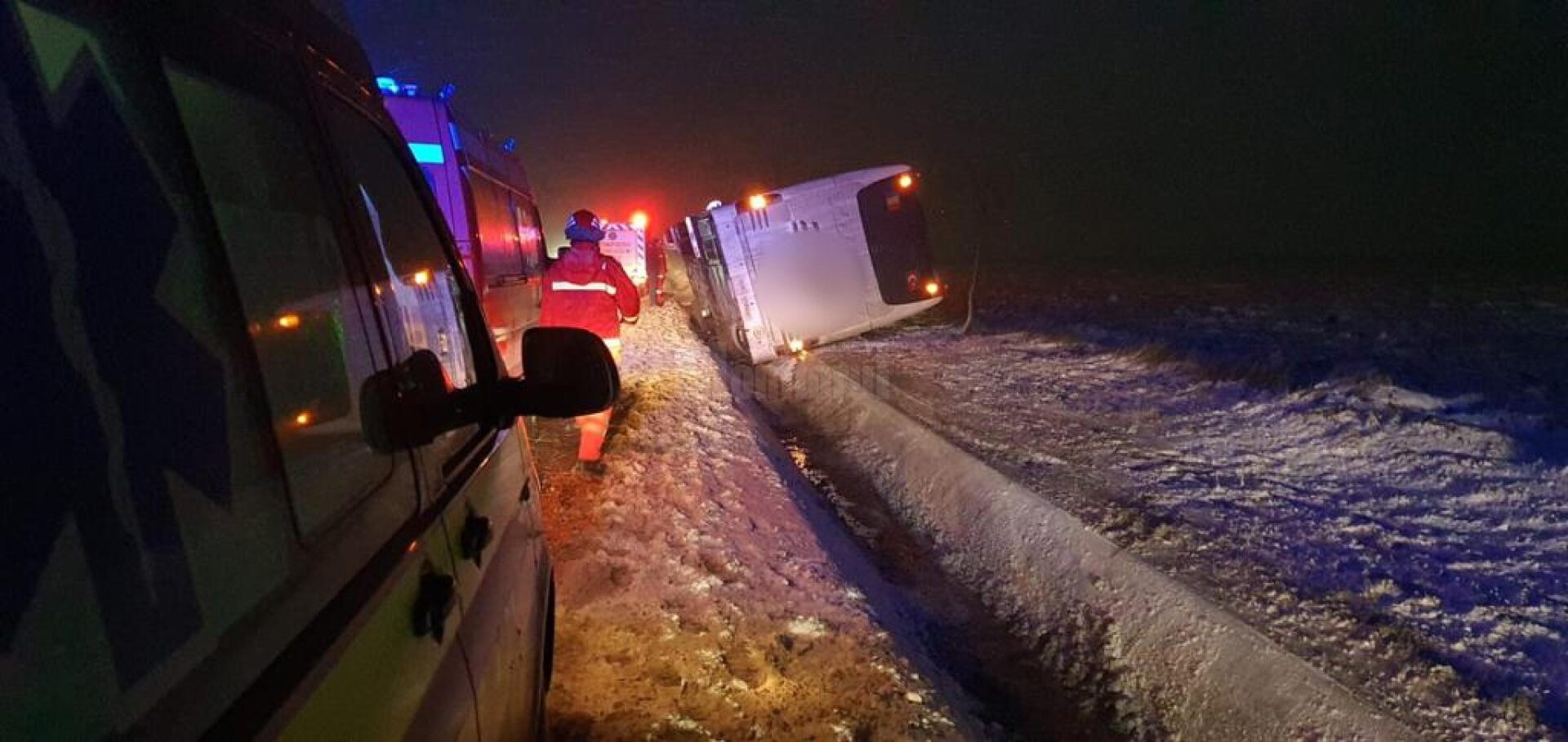 Autocar răsturnat în afara drumului, la ieșire din Salcea spre Dumbrăveni