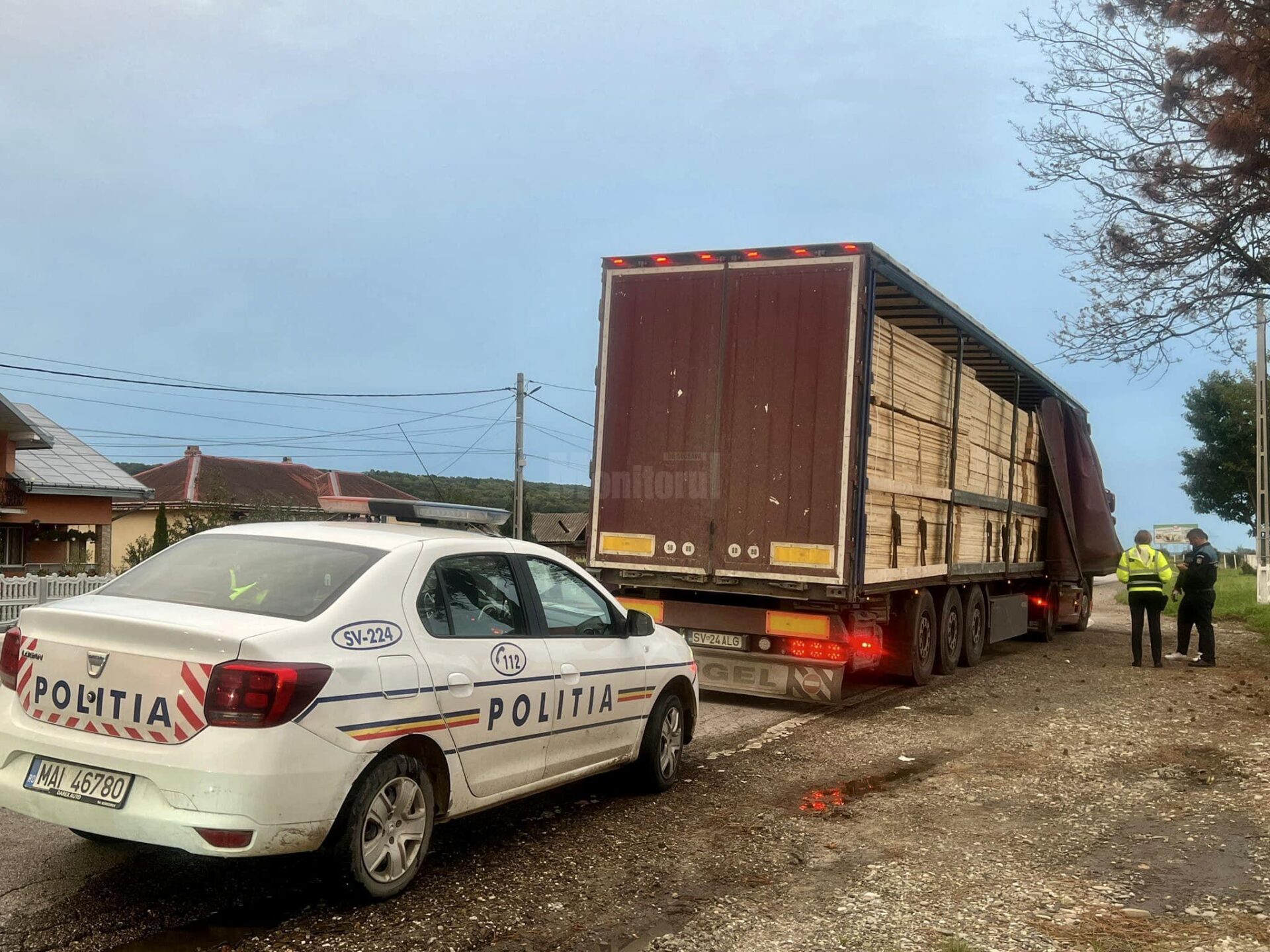 Polițiștii, cu sprijinul lucrătorilor ocolului Silvic Fălticeni, au examinat materialul lemnos din autotrenul tras pe dreapta și s-a constatat că