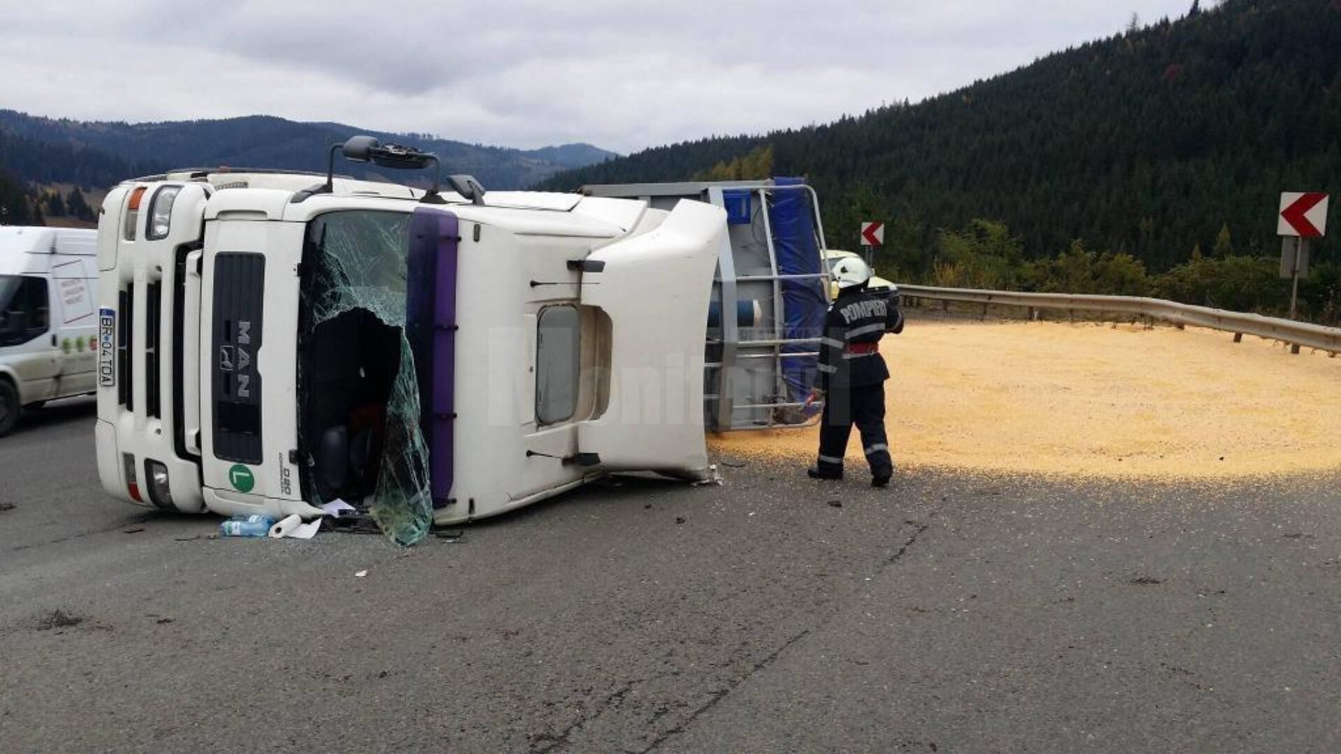 Un autotren încărcat cu 25 de tone de boabe de porumb s-a răsturnat, o mare parte din încărcătură (aproximativ 15 tone) împrăștiindu-se pe șosea.