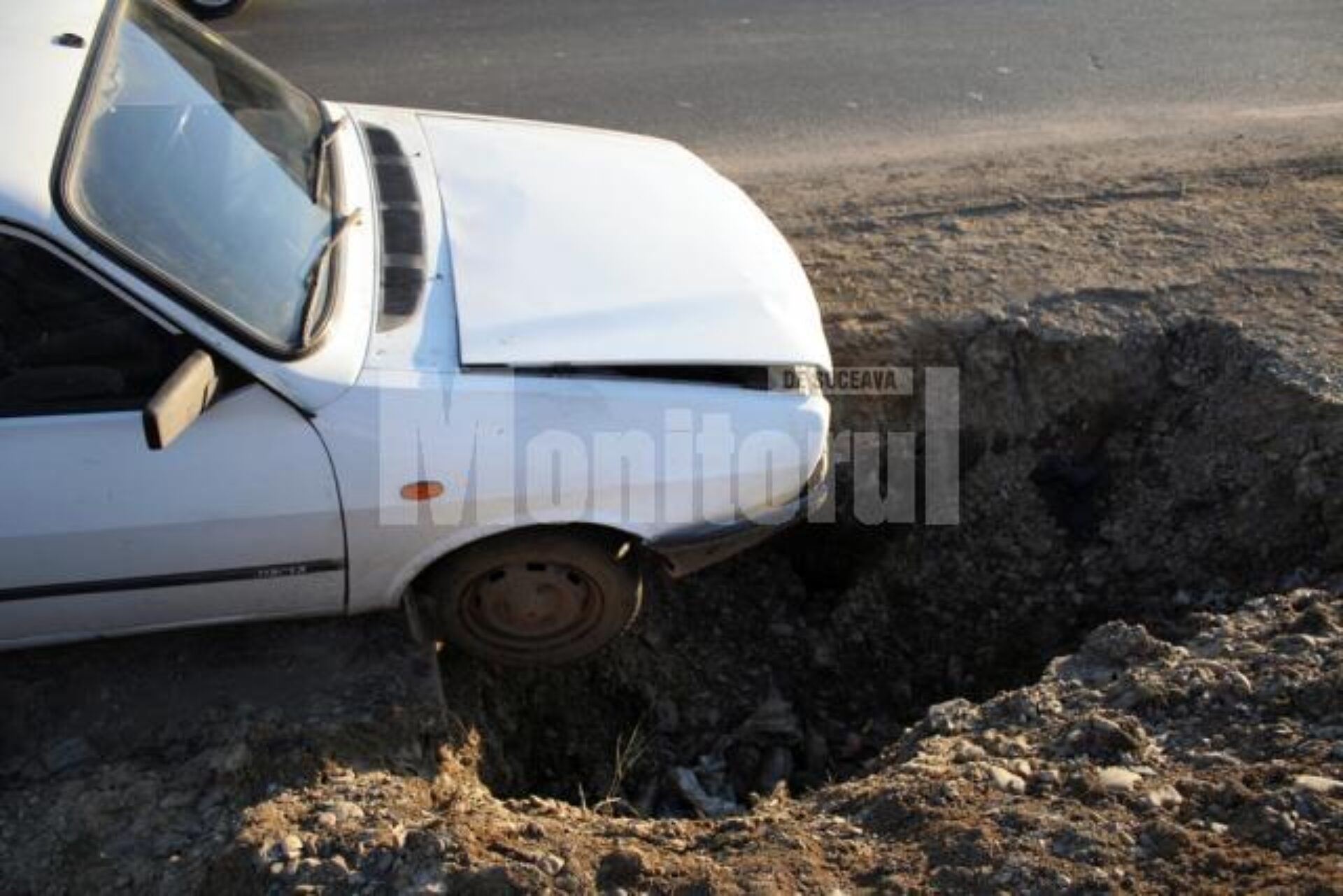 Inconștiență și nesimțire. Un sucevean a fost la un pas de accident, după ce autoturismul Dacia cu care mergea spre Fălticeni a intrat cu botul într-o groapă imensă, adâncă de mai bine de un metru și cam tot atâta de lată, lăsată nesemnalizată, pe marginea drumului.
