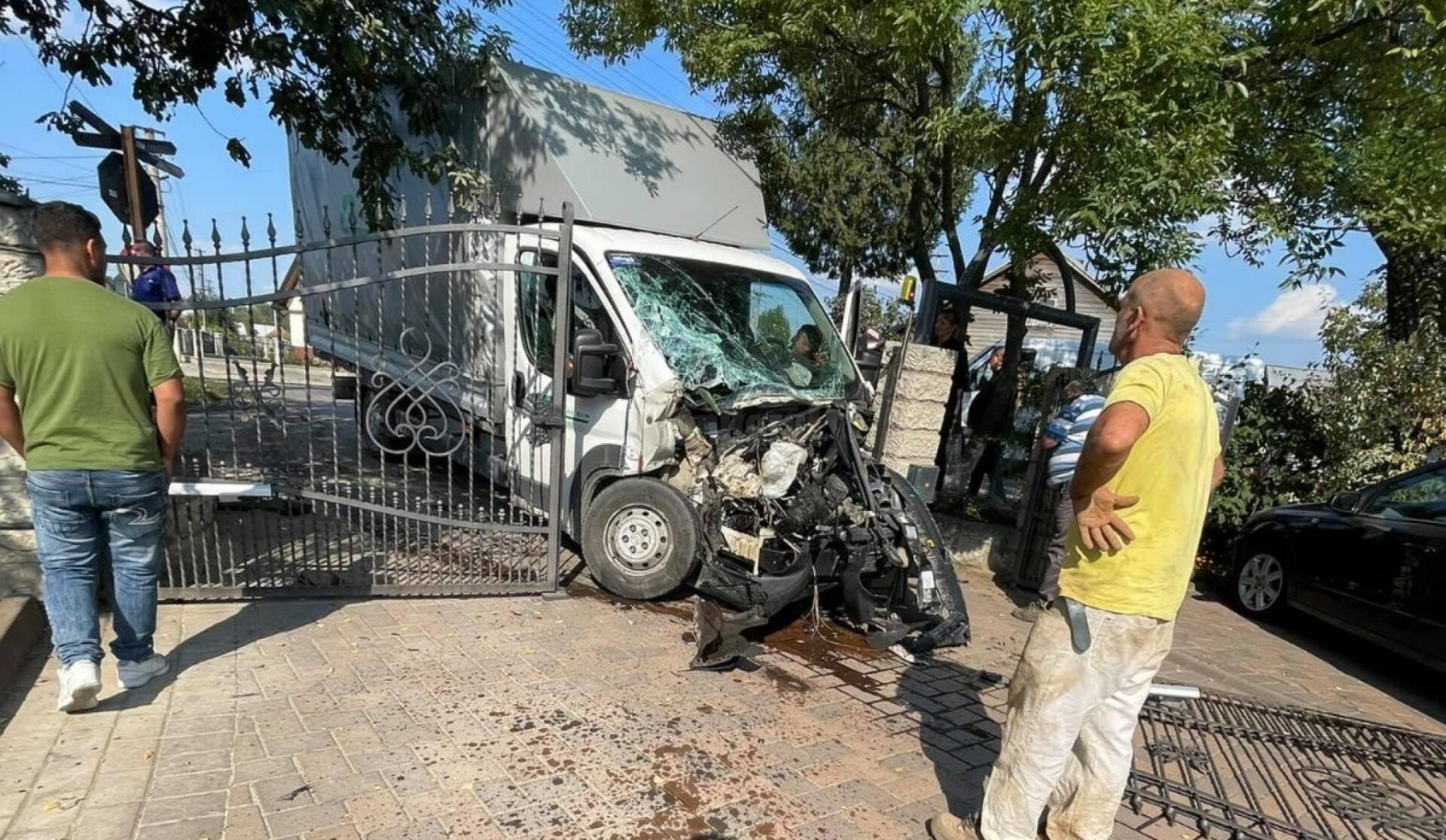 Autoutilitară proiectată într-un gard, la Rădăuți, după ce a fost acroșată de trenul de Putna
