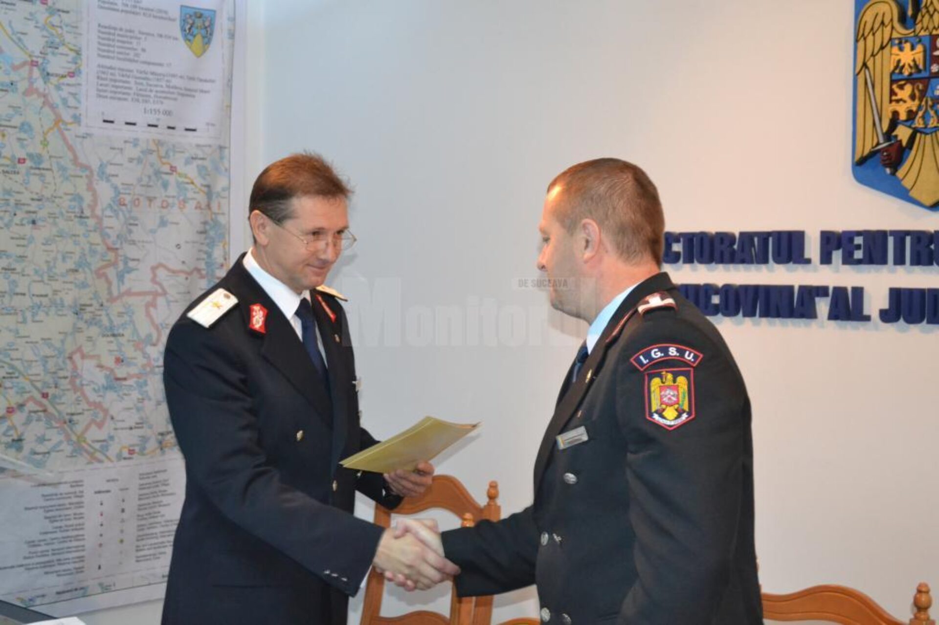 Premergător evenimentelor care se vor desfășura de Ziua Pompierilor din România, vineri, la sediul Inspectoratului pentru Situații de Urgență „Bucovina” al județului Suceava, au fost avansați în gradul următor, înaintea expirării stagiului minim, șapte pompieri militari, pentru rezultatele excepționale în îndeplinirea atribuțiilor specifice.Astfel, în temeiul Ordinului Viceprim-ministrului pentru securitate națională, ministrul Afacerilor Interne Gabriel Oprea și al inspectorului general al IGSU, colonelul dr. Nicolae Cornea, inspectorul-șef al pompierilor militari suceveni, generalul de brigadă dr. Ion Burlui, a oferit tresele pentru 2 ofițeri (de la gradul de maior la locotenent-colonel și de la gradul de locotenent la căpitan) și 5 subofițeri (patru plutonieri majori la gradul de plutonieri adjutanți și un plutonier la gradul de plutonier major). Tot în acest cadru festiv, inspectorul-șef a conferit/acordat, pentru 4 pompieri militari, Plachete onorifice, Distincții de serviciu-insigne simbol și Insigne onorifice – „Pompier de onoare al județului Suceava” și „Salvator de onoare al județului Suceava”, pentru rezultatele obținute. De asemenea, pentru efortul depus la promovarea valorilor pompierilor militari, onoarea și demnitatea manifestate pe timpul desfășurării activității profesionale, au fost acordate diplome de merit pentru 105 cadre militare din întreg efectivul Inspectoratului pentru Situații de Urgență „Bucovina” al județului Suceava.Nu în cele din urmă, publicația „Agenda Pompierului” a acordat diplome de merit și insigne „Cavaler al frontului incandescent” pentru 11 pompieri militari suceveni.La final, preotul militar Ovidiu Iacob a ținut un cuvânt duhovnicesc celor prezenți și a lansat din nou invitația la evenimentele care se vor desfășura duminică – 13 septembrie, Ziua Pompierilor din România (la sediul inspectoratului și în parcarea Iulius Mall), și marți – 15 septembrie, Sărbătoarea Sfântului Ierarh Iosif cel Nou de la Partoș, ocrotitorul pompierilor (la Biserica Militară).