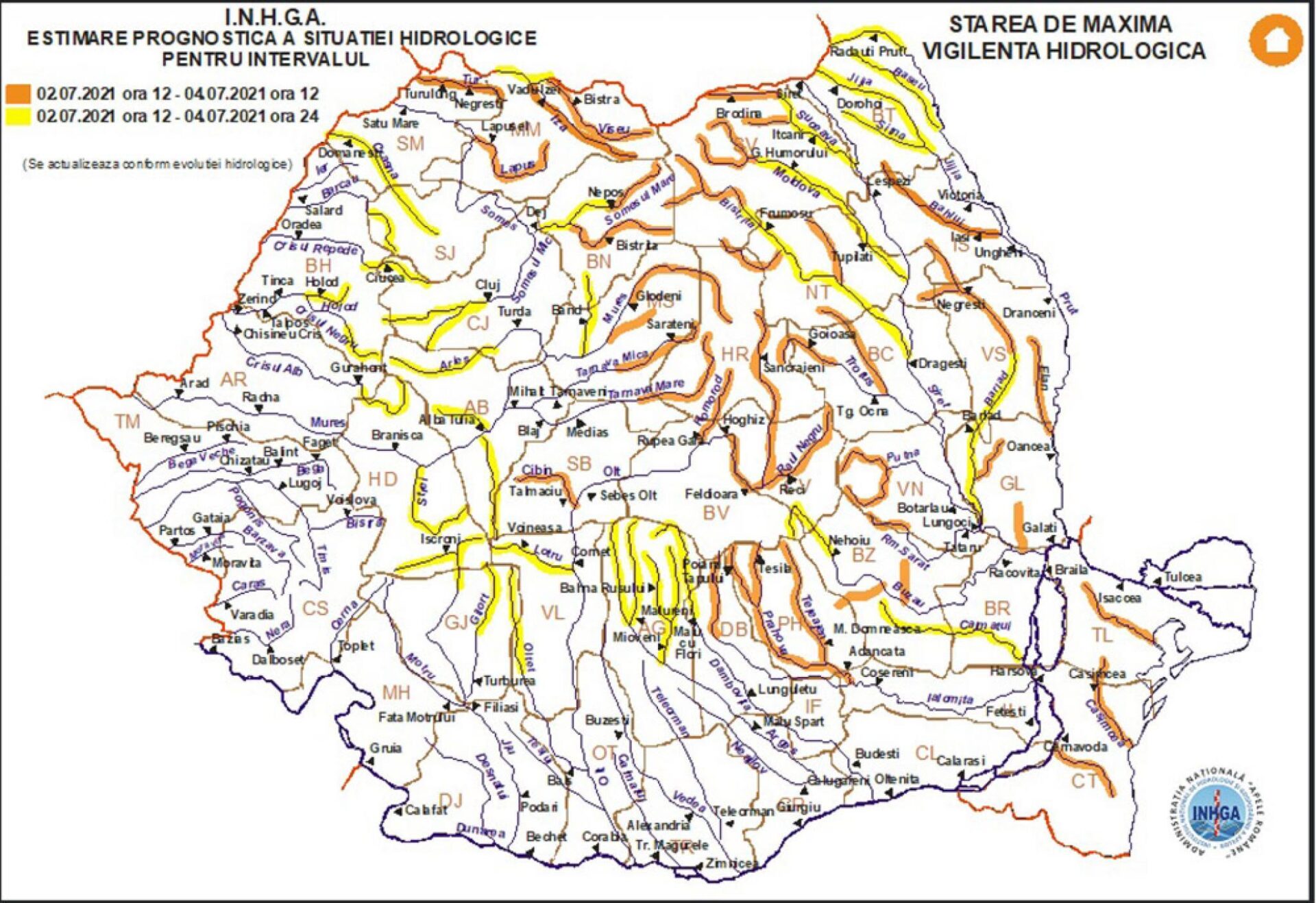 În intervalul 02.07.2021 ora 12:00 – 04.07.2021 ora 24:00 pe râurile din bazinele hidrografice: