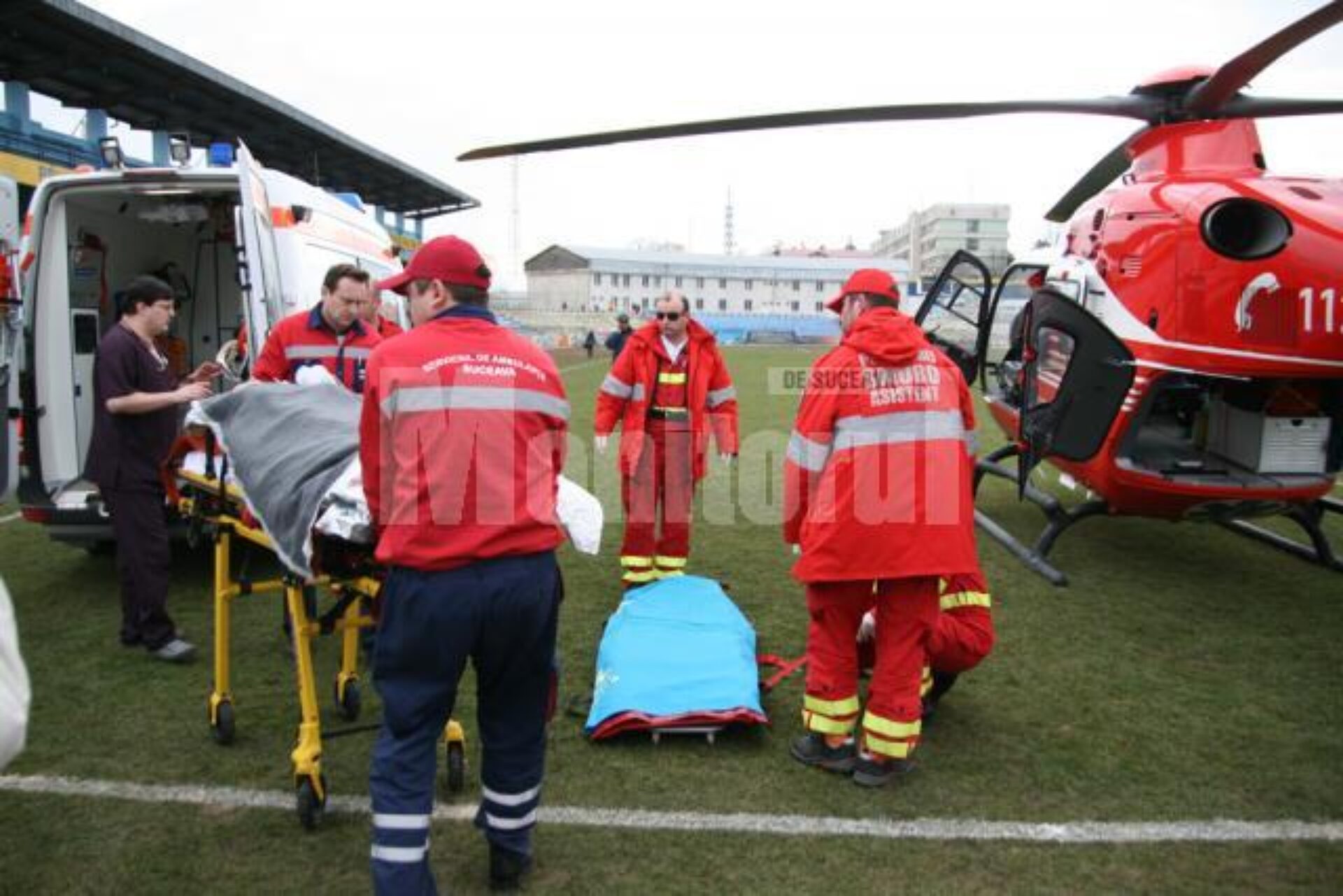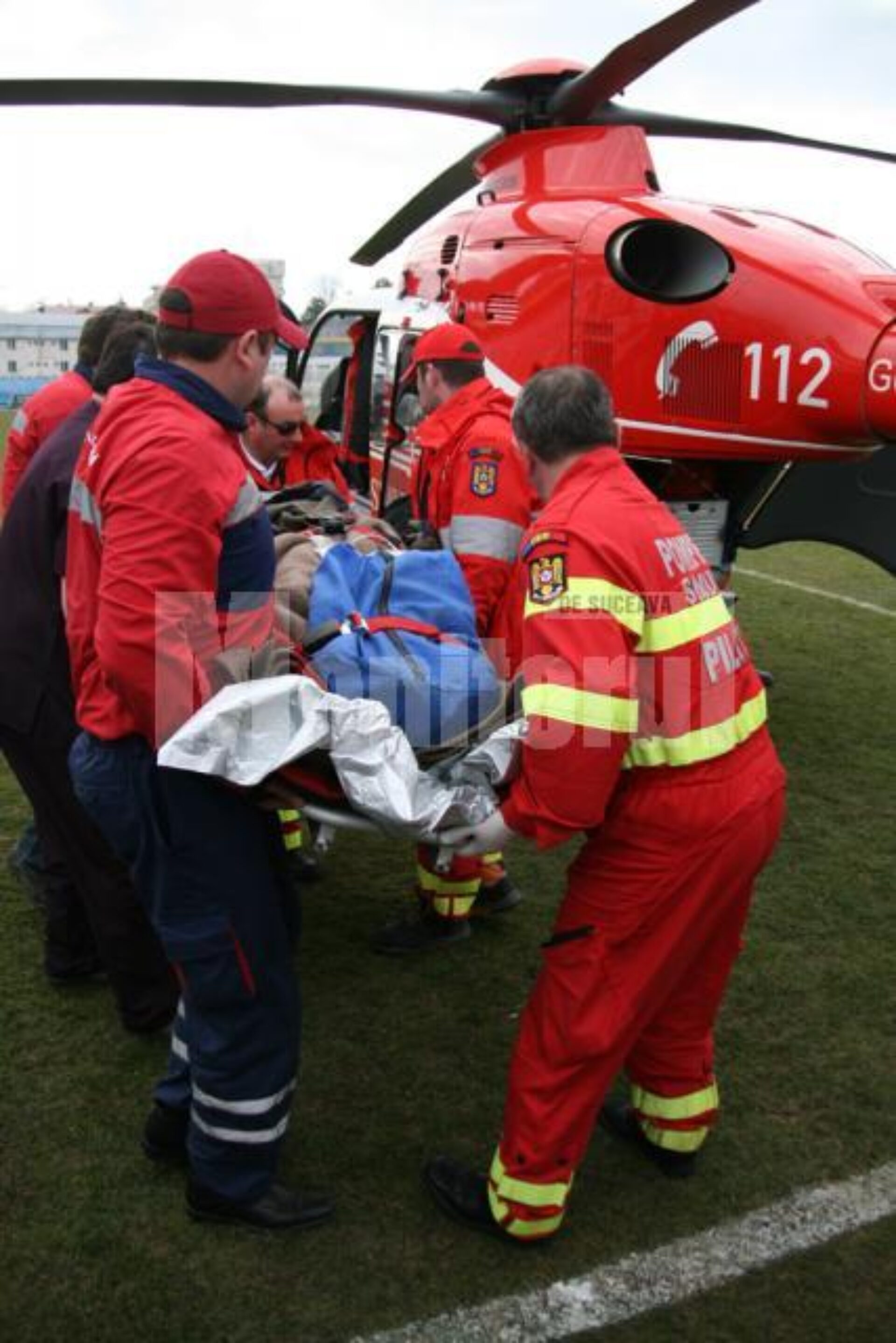 Supus unei operații în clinica universitară Ionel Irimescu a fost adus la Spitalul Județean de Urgență cu o ambulanță, în jurul orei 13.00. O oră mai târziu, după ce medicii i-au făcut toate investigațiile, inclusiv un computer tomograf, și l-au stabilizat, au fost începute demersurile pentru aducerea la Suceava a unui elicopter SMURD, care a aterizat pe stadionul Areni la ora 15.15. “Pacientul a suferit un traumatism cranio-vertebral, fiind atinsă coloana vertebrală la nivelul regiunii cervicale. Bolnavul a fost stabilizat hemodinamic și respirator, dar prezenta o tetrapareză, motiv pentru care a fost transferat la Târgu Mureș”, a explicat dr. Liviu Cîrlan, șeful Unității de Primire a Urgențelor din cadrul Spitalului Suceava.