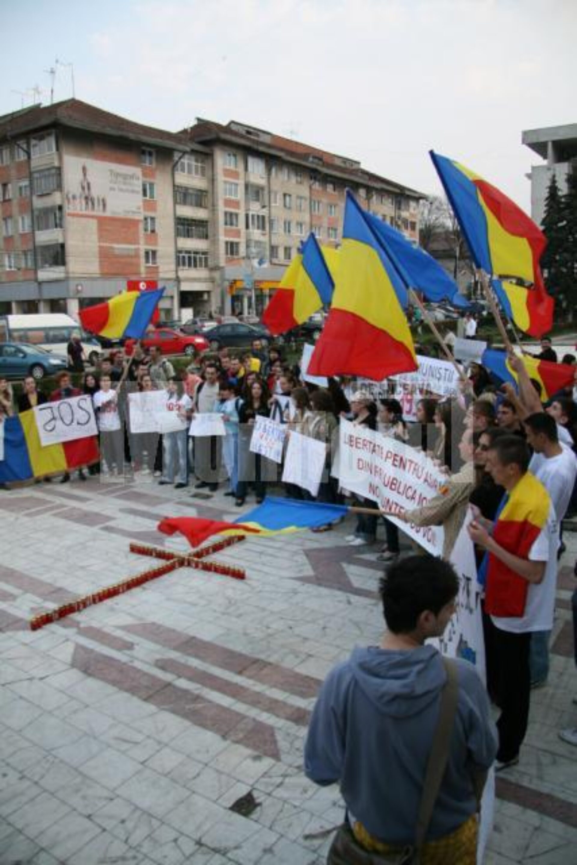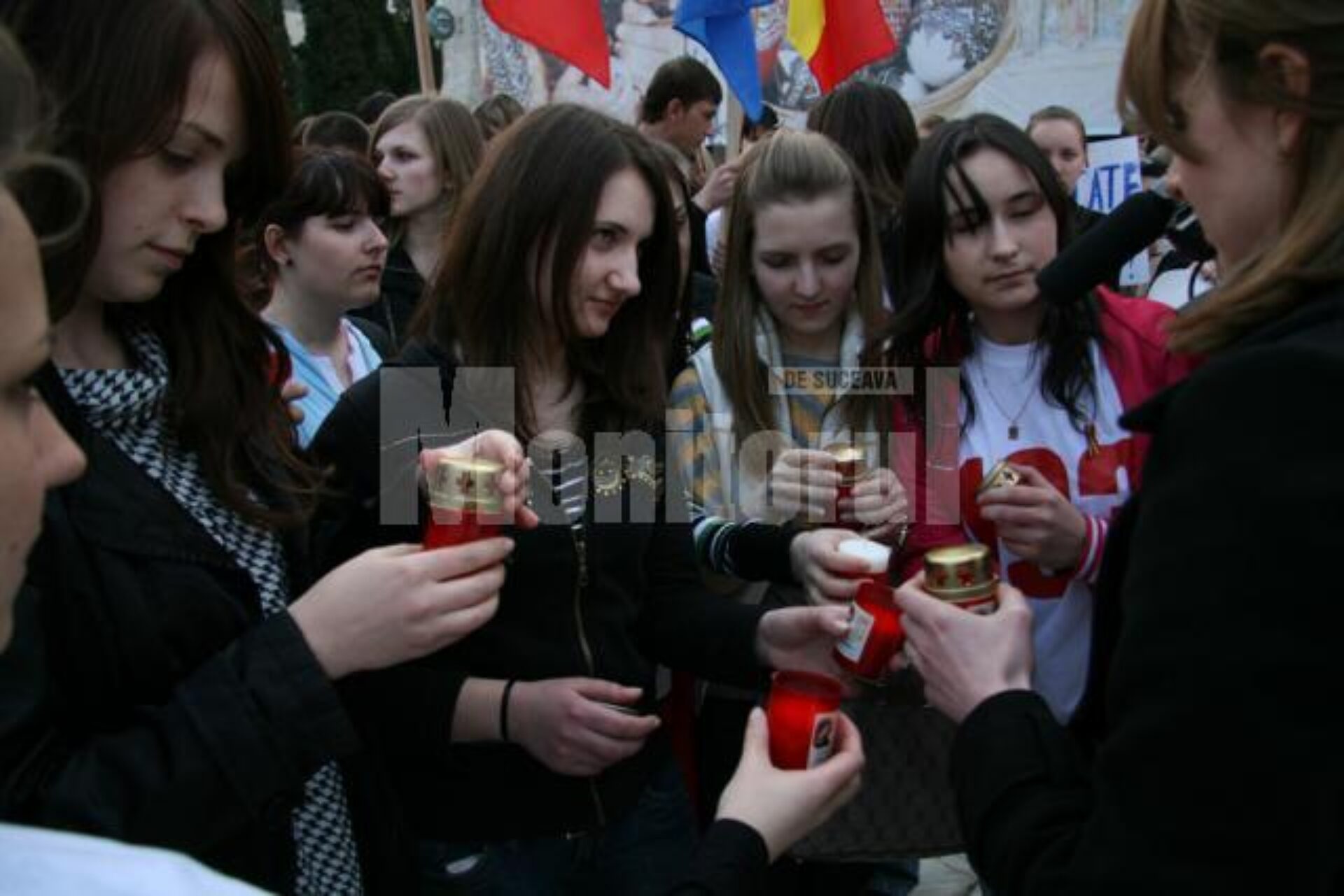 Toți tinerii participanți la protest au ținut în mâini lumânări aprinse, din care au format ulterior o cruce, întinsă pe esplanada Casei de Cultură.