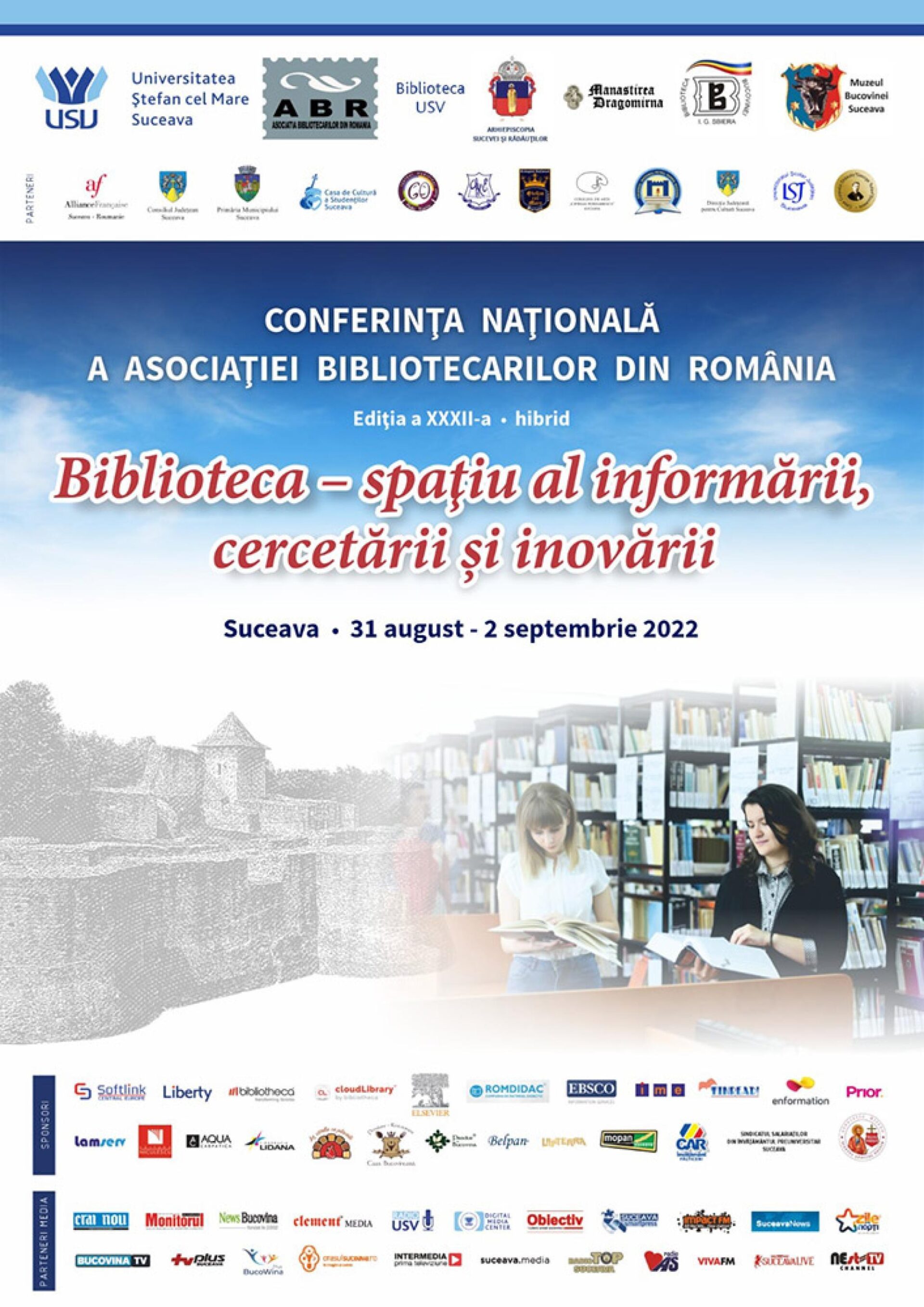 Începând de azi, timp de trei zile, Universitatea „Ștefan cel Mare” din Suceava, Biblioteca Academică suceveană și Asociația Bibliotecarilor din România (ABR) organizează, împreună cu Arhiepiscopia Sucevei și Rădăuților, Biblioteca Județeană „I.G. Sbiera”, Muzeul Național al Bucovinei și Mănăstirea Dragomirna, cea de a XXXII-a ediție a Conferinței Naționale a ABR. Tema conferinței va fi „Biblioteca – spațiu al informării, cercetării și inovării”, un număr important de instituții culturale și administrative alăturându-se organizatorilor principali și devenind partenerii acestei ediții. Între aceștia enumerăm Alianța Franceză din Suceava, Consiliul Județean Suceava, Primăria Municipiului Suceava, Casa de Cultură a Studenților, Teatrul Național „Matei Vișniec”, Inspectoratul Școlar Județean Suceava, Casa Corpului Didactic „George Tofan”, Colegiul Național „Mihai Eminescu”, Colegiul de Artă „Ciprian Porumbescu”, Colegiul Național „Petru Rareș” și Colegiul Tehnic „Mihai Băcescu” Fălticeni.